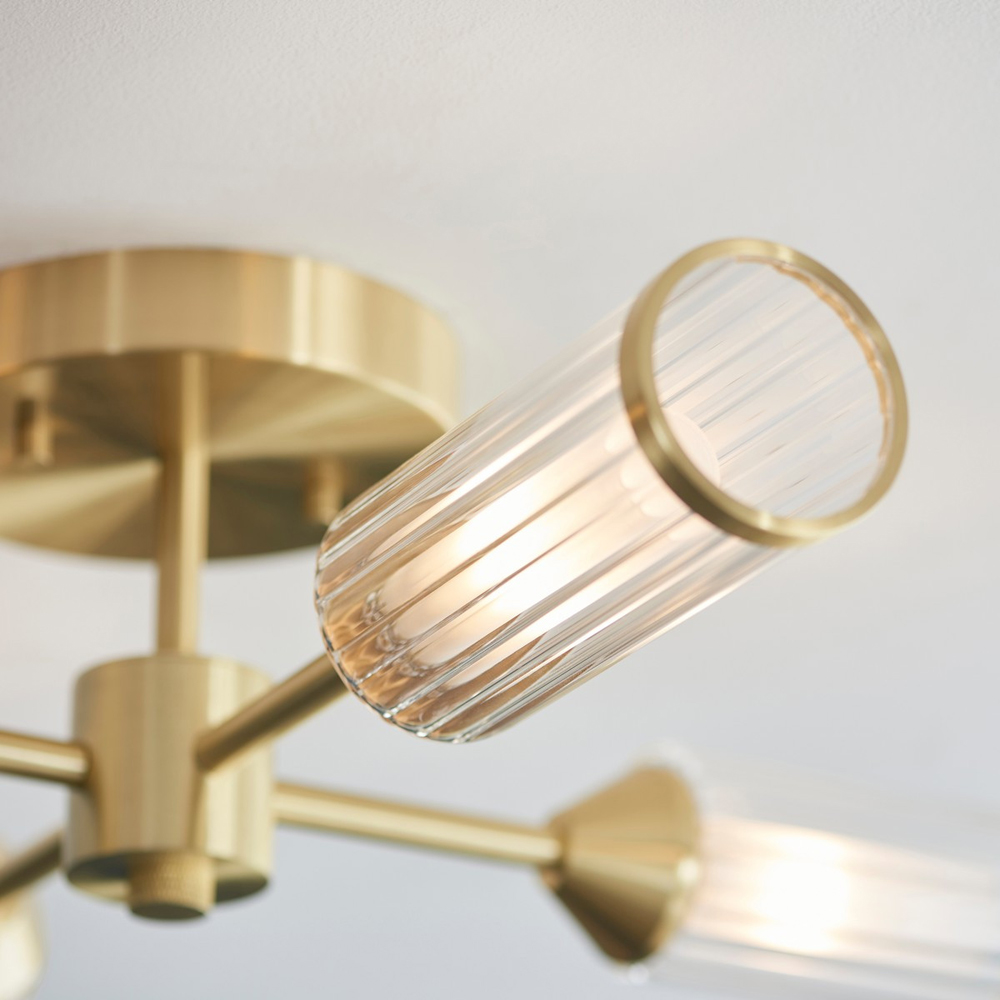 Enhance your home's ambiance with the Merano Trieste multi-arm semi flush ceiling lamp. Its clear ribbed glass shades, accented with metal edging and complemented by satin brass plated metalwork, create a sophisticated look. Frosted inner glass diffusers soften the light, and the fixture is dimmable and compatible with G9 LED lamps for brilliant, adaptable illumination.
