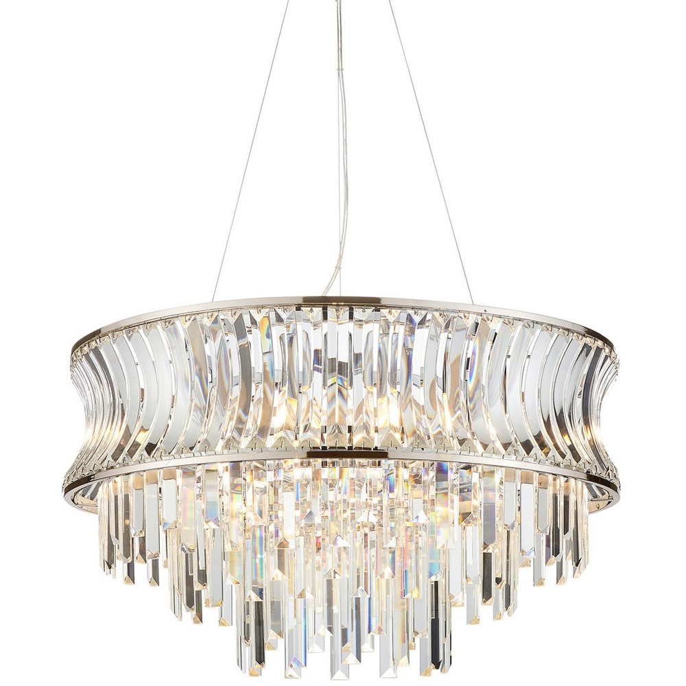 The Merano Vittoria pendant ceiling light makes a stunning statement. Its bright nickel plate finish beautifully complements polished nickel-plated metalwork and high-quality, clear-cut faceted crystals. Decorative clear-faceted concave glass adds to its elegance. This large chandelier features a height-adjustable chain and a 1.5-meter clear cable, ensuring brilliant illumination. Compatible with E14 LED lamps (not included), it's also dimmable, offering adaptable ambient lighting to enhance any home décor.