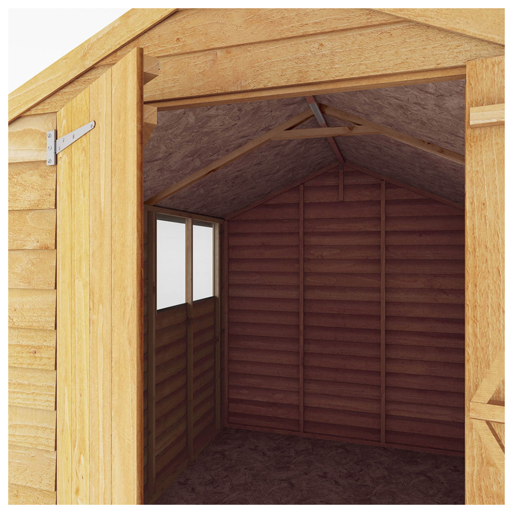 This overlap apex garden shed offers a spacious and affordable storage solution for all your gardening needs. Easily store larger items such as lawnmowers, bicycles, and wheelbarrows thanks to its double doors. The horizontally overlapping wall boards create strong, weather-resistant panels, shielding your belongings from rain and damp. Inside, a sturdy wooden frame ensures a rigid and long-lasting structure. The classic apex roof design provides ample headroom for taller items and storage units. Both the floor and roof are constructed from durable solid sheet board, a multi-layered material ideal for everyday use. Assembly is straightforward with all necessary roofing felt, fixtures, fittings, detailed instructions, and manufacturer recommendations included. Enjoy peace of mind with a 10-year anti-rot guarantee and a 12-month manufacturer',s warranty.