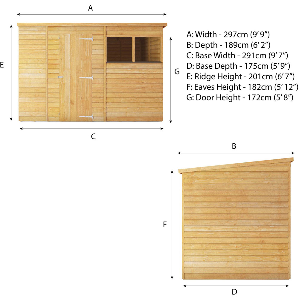 This stylish and functional Mercia Garden overlap pent wooden shed offers a contemporary storage solution for your gardening equipment and more. Its spacious interior easily accommodates items such as bicycles and lawnmowers. Natural light floods the interior thanks to a shatterproof styrene window. Crafted in the UK from ethically sourced, FSC®-certified timber, this shed provides secure, high-value storage. The horizontally overlapping wall boards form a robust panel designed to effectively shed rainwater, keeping your contents dry. A durable solid sheet board (multiple layers of tightly compacted oriented strands) makes up both the floor and roof, perfect for everyday use. Strong internal wooden framing supports the overlapping panels, creating a rigid and long-lasting structure. For stress-free assembly, high-quality roofing felt, fixtures, fittings, detailed instructions, and manufacturer recommendations are included. Your purchase is protected by a 10-year conditional anti-rot guarantee and a 12-month manufacturer’s warranty. Note that annual re-treatment is required to maintain the anti-rot guarantee. Dimensions: H200.7 x W297.4 x D189.1cm.