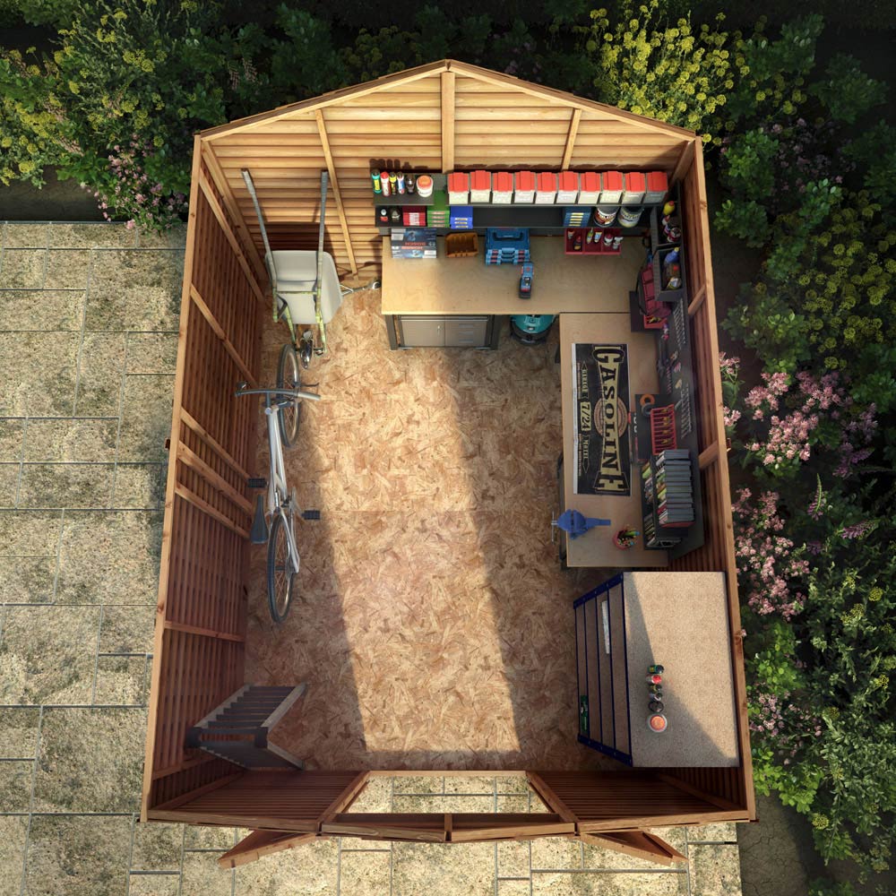 Expand your garden storage with this 10ft x 8ft overlap apex wooden shed. Its spacious interior and double doors provide easy access for storing larger items such as lawnmowers, bicycles, and garden furniture. The windowless design ensures security and privacy. Crafted in the UK from ethically sourced, FSC®-certified timber, the shed',s horizontal overlapping boards create strong, weather-resistant walls. The sturdy internal wooden frame ensures a rigid and long-lasting structure. The apex roofline maximizes headroom, while the solid sheet board floor and roof offer durable protection for your belongings. All necessary roofing felt, fixtures, fittings, detailed instructions, and manufacturer',s recommendations are included for straightforward assembly. A 10-year anti-rot guarantee (conditional upon annual re-treatment) and a 12-month manufacturer’s warranty are provided.