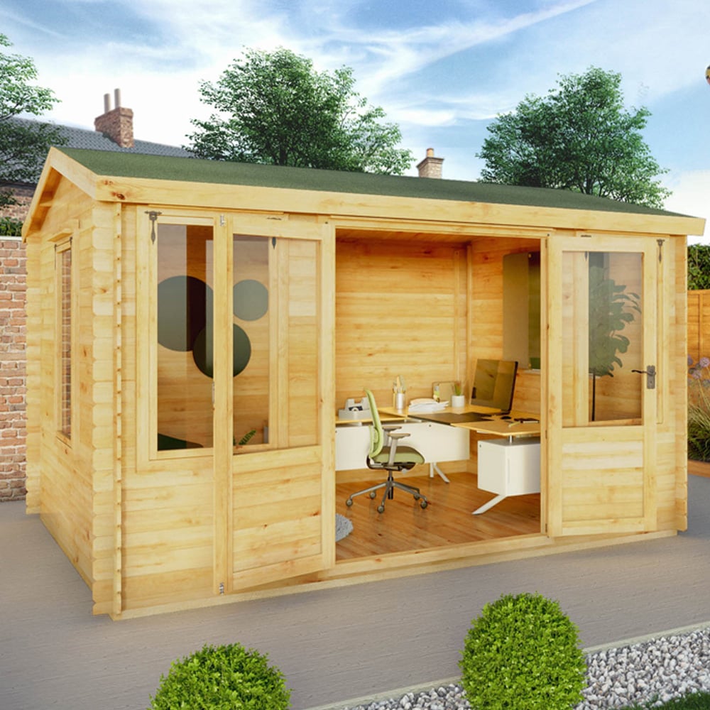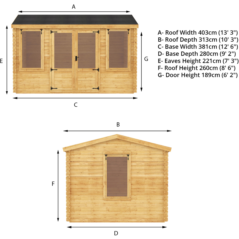 This 4m x 3m log cabin offers a stylish, open-plan design with traditional features. Designed to maximise your living space while enjoying the outdoors, it',s perfect as a home office, entertainment area, or simply a relaxing retreat. Large windows on the front and side provide panoramic garden views. High-strength SAN styrene glazing – a safe, shatterproof alternative to glass – is used throughout, ideal for busy gardens or families with young children.