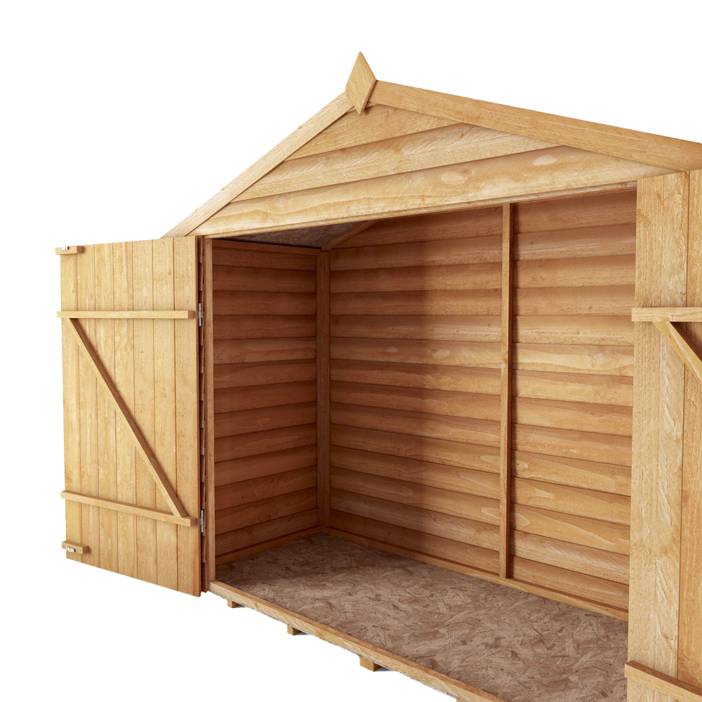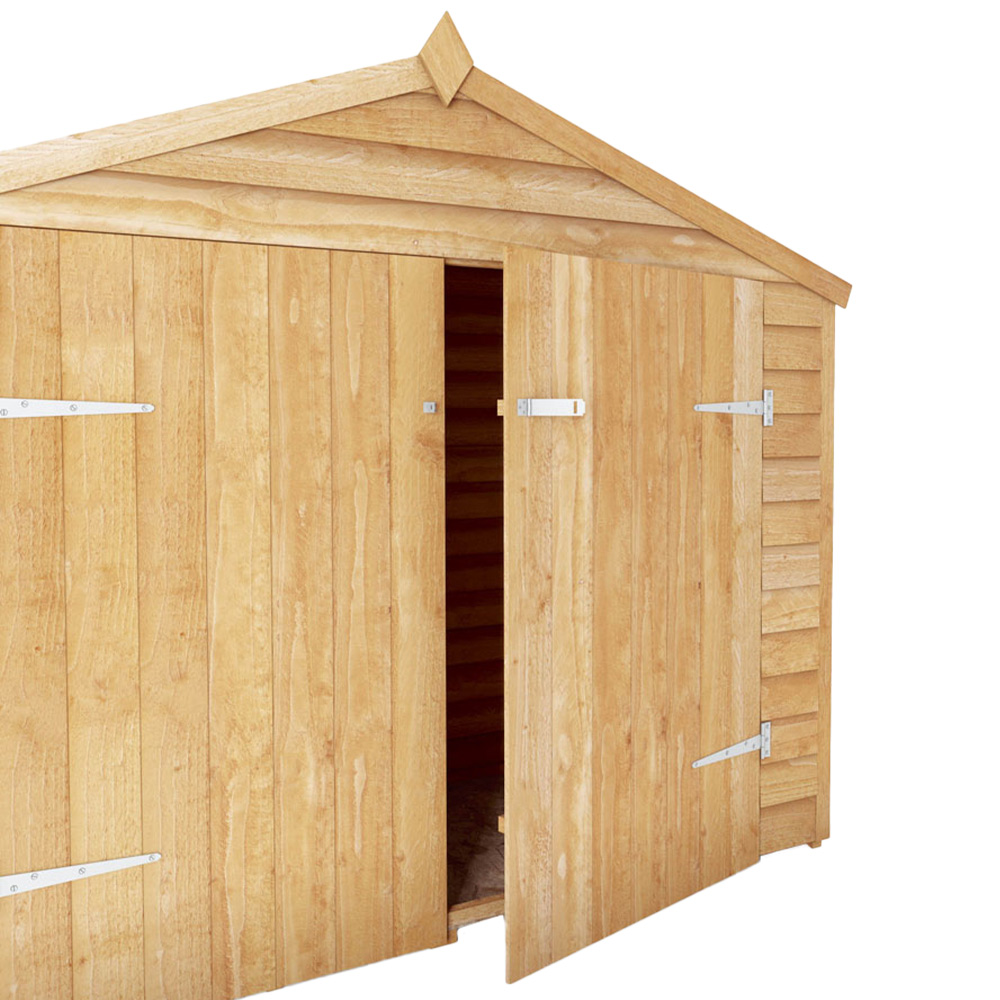 Keep your bicycles safe and dry in this stylish 3x7ft overlap apex bike store. Its traditional design complements any garden, while large double doors ensure easy access. Crafted in the UK from ethically sourced, FSC® certified timber, this shed offers secure and affordable storage. The overlapping horizontal wall boards form a strong, water-shedding panel, protecting contents from the elements. Durable solid sheet board (multiple layers of tightly compacted oriented strands) makes up the floor and roof, perfect for everyday use. Thick internal wooden framing reinforces the structure, creating a rigid, long-lasting build. The apex roof design efficiently channels rainwater away. Complete with roofing felt, fixtures, fittings, detailed instructions, and manufacturer recommendations for easy assembly. Includes a 10-year conditional anti-rot guarantee and a 12-month manufacturer’s warranty (annual re-treatment required to maintain the guarantee.