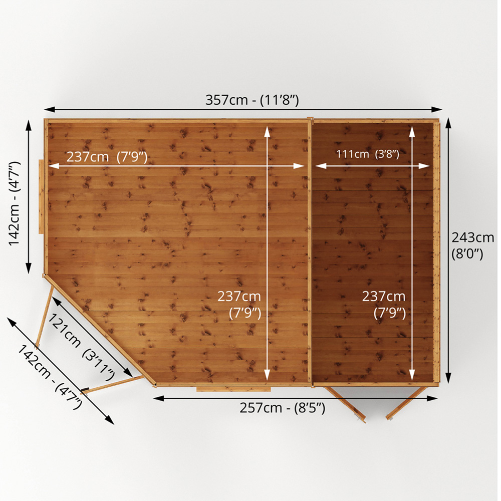 Transform your garden into a stunning retreat with the Mercia Corner Summerhouse with Side Shed 8 x 12ft. Made from sustainably sourced timber, the summerhouse is a perfect addition to any garden. This beautifully designed wooden summerhouse maximises outdoor space while offering breathtaking panoramic views. Featuring fixed windows and double doors, all glazed with styrene, the interior is bright and welcoming. Stylish brushed chrome effect handles and hinges, along with a secure lock and key, add a touch of elegance and safety. With a practical side shed, this garden building provides ample storage for all your garden essentials. The walls are crafted from premium horizontal interlocking tongue and groove boards with a shiplap profile, ensuring a weatherproof and enduring structure. Inside, thick wooden framing supports the high-quality cladding, while heavy-duty tongue and groove boards form a robust roof and floor. Easy assembly is guaranteed with standard robust fixtures and fittings, along with detailed instructions. It comes with a 10 year anti-rot guarantee and a 12-month manufacturer’s warranty. Regular preservative and waterproof treatment will keep this beautiful building in top shape, and it must be constructed on a solid, level base.