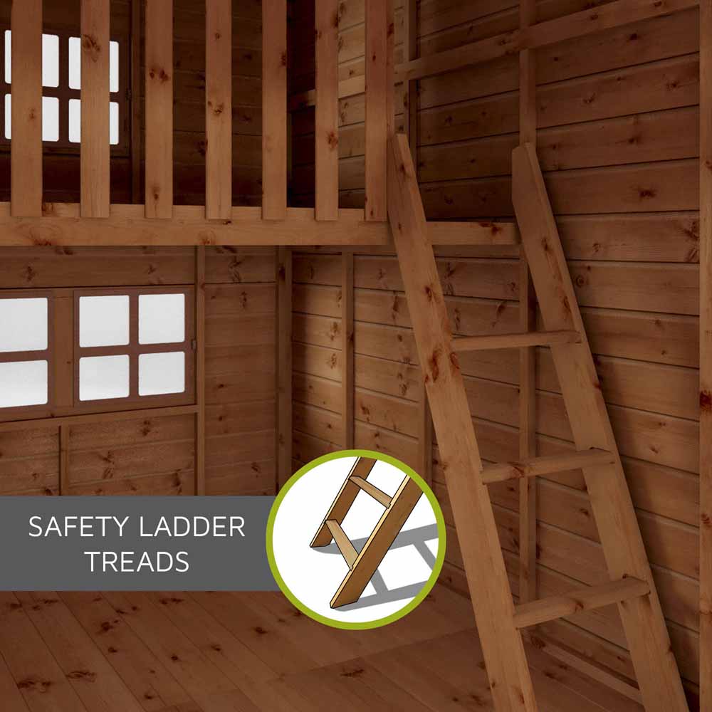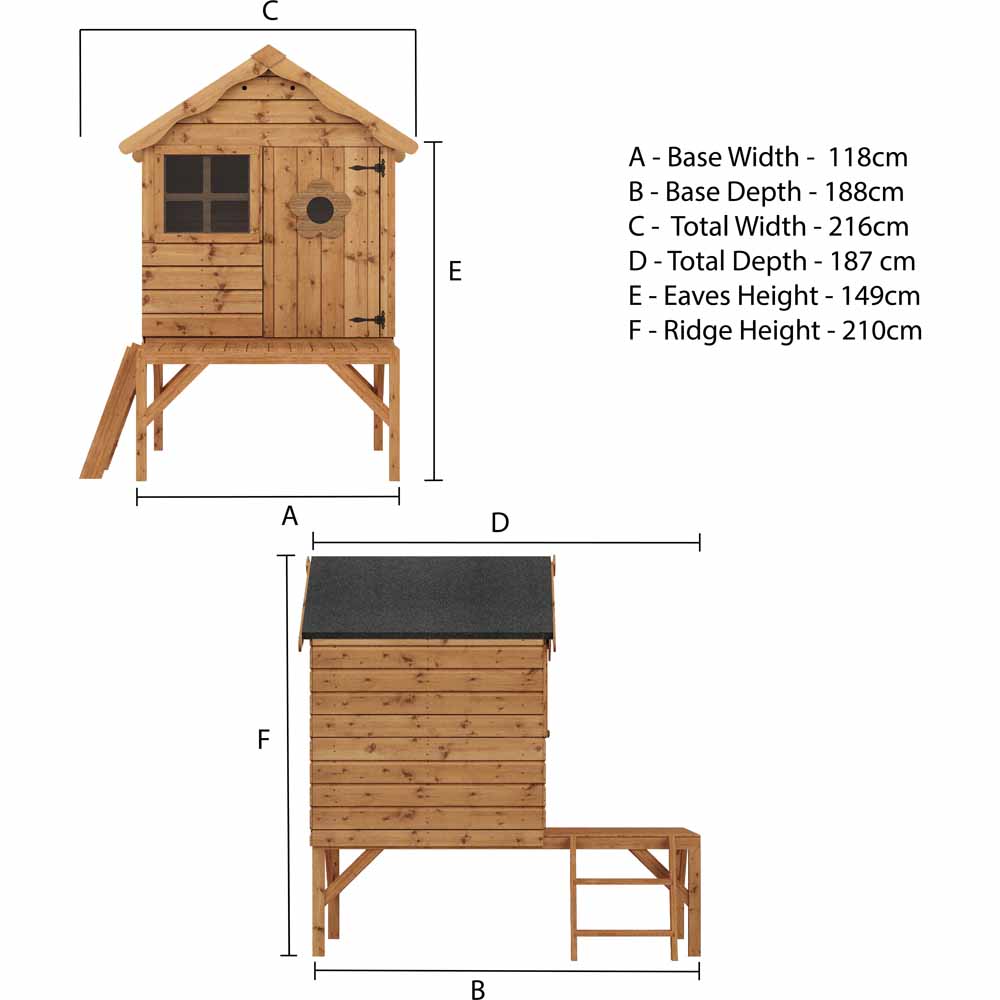 The Mercia Snug Tower Playhouse provides endless fun for children. Its elevated platform ignites imaginative play, making it an instant favourite! Designed with safety in mind and awarded the EN71 Safety Certificate, this playhouse is perfect for younger children and smaller gardens. Strong, weather-resistant walls are constructed from high-quality shiplap tongue and groove cladding, keeping out drafts and water. A durable solid sheet board floor and roof ensure it can withstand daily adventures. Smooth, splinter-free timbers and a cleverly designed door prevent injuries. Charming Georgian-style windows feature shatterproof styrene glazing for extra safety. Complete with roofing felt, fixtures, fittings, detailed instructions, and manufacturer recommendations for easy assembly, this playhouse is ready for personalization. Create a unique outdoor space your children will adore! It boasts a conditional ten-year anti-rot guarantee and a 12-month manufacturer’s warranty (annual re-treatment required). Suitable for children aged 36 months.
