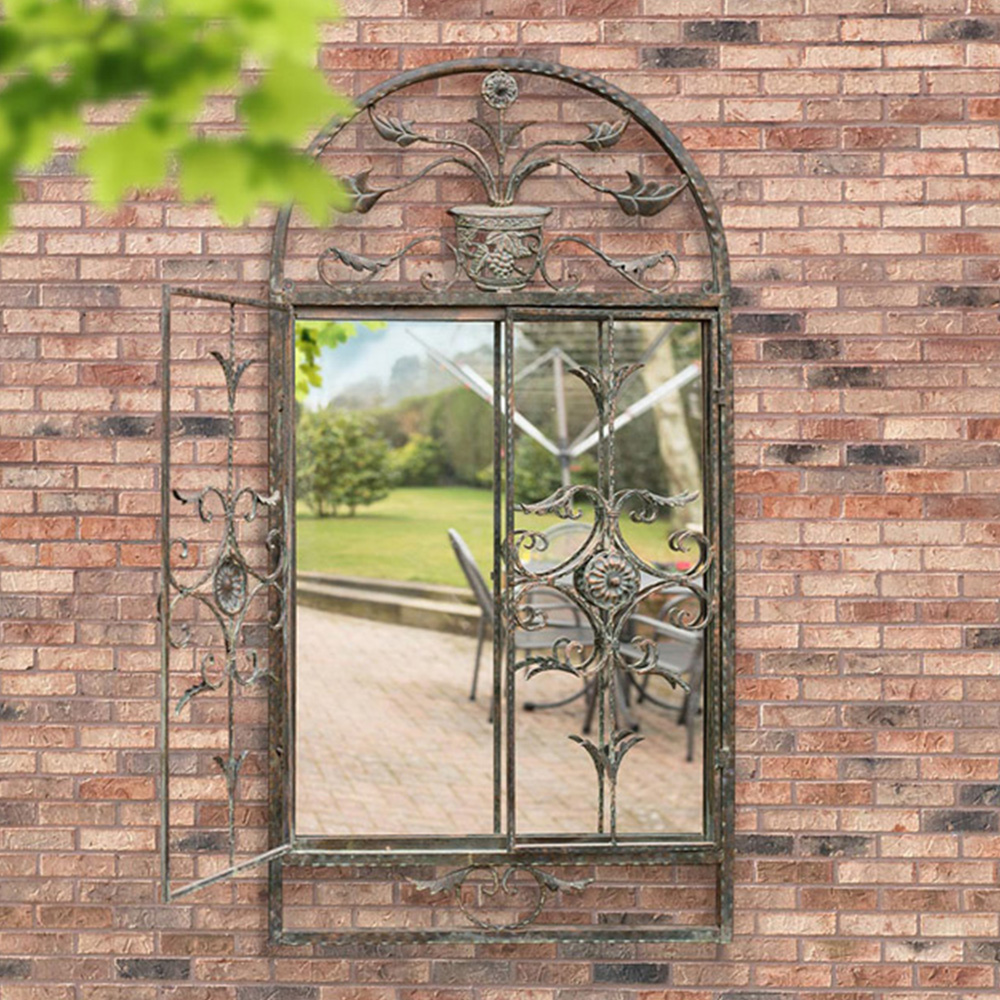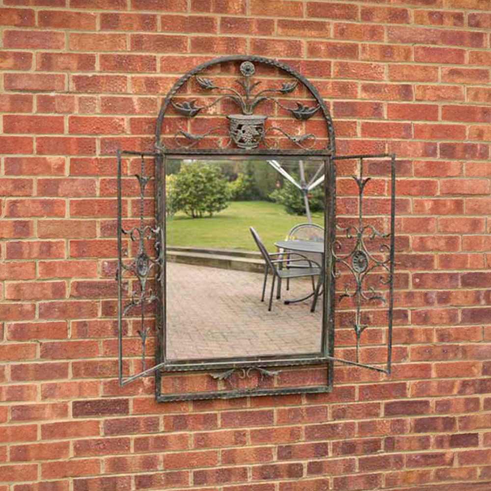 Enhance your outdoor space with the Dorset Rustic Scroll Outdoor Wall Mirror. This mirror boasts opening doors revealing a generous view, adding rustic charm to any setting, indoors or out. Its keyhole fixing ensures straightforward installation – simply hook it onto a screw. The mirror measures 130cm x 70cm with closed doors, expanding to 130cm x 132cm when open. Fully insured delivery guarantees arrival in perfect condition. The rustic design is weather-resistant.