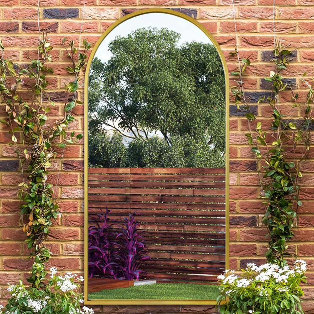 Enhance your interior or exterior space with this striking arched garden wall mirror. Its elegant gold metal frame complements the premium mirror glass, while a waterproof backing ensures durability. Simple to install with two keyhole fixings for secure hanging, this 180 x 90cm mirror effortlessly enhances a variety of décor styles.