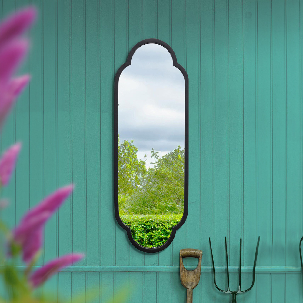 Elevate your home or garden with the Duplici Black Metal Double Arched Oval Outdoor Wall Mirror. This striking piece boasts a black metal frame, creating a captivating focal point for both indoor and outdoor use. The mirror glass is securely mounted to an all-weather backing, ensuring it withstands the elements. Its unique double-arched design is truly distinctive, offering a generous reflective surface. Pre-welded keyhole fixings on the back make installation a breeze, simply use appropriate wall fixings for your wall type. Delivery is fully insured for peace of mind. The mirror measures 102cm x 36cm.