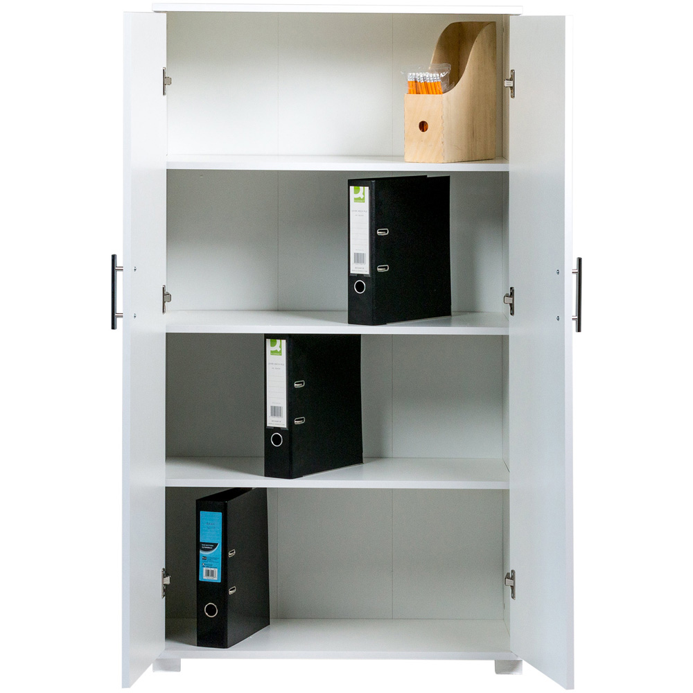Maximise your workspace efficiency with this white wooden two-door lockable filing cabinet, designed to offer both security and ample storage. Featuring three generous shelves, this cabinet accommodates everything from large boxes and briefcases to stationery and box files. Constructed from durable, easy-to-clean MDF, it combines practicality with a timeless aesthetic, making it suitable for offices, classrooms and various work environments. The flat-pack design ensures straightforward assembly with the provided instructions. Dimensions: 1400mm (H) x 800mm (W) x 350mm (D). Keep your essential materials safe, organised and within easy reach with this elegant and functional storage solution.
