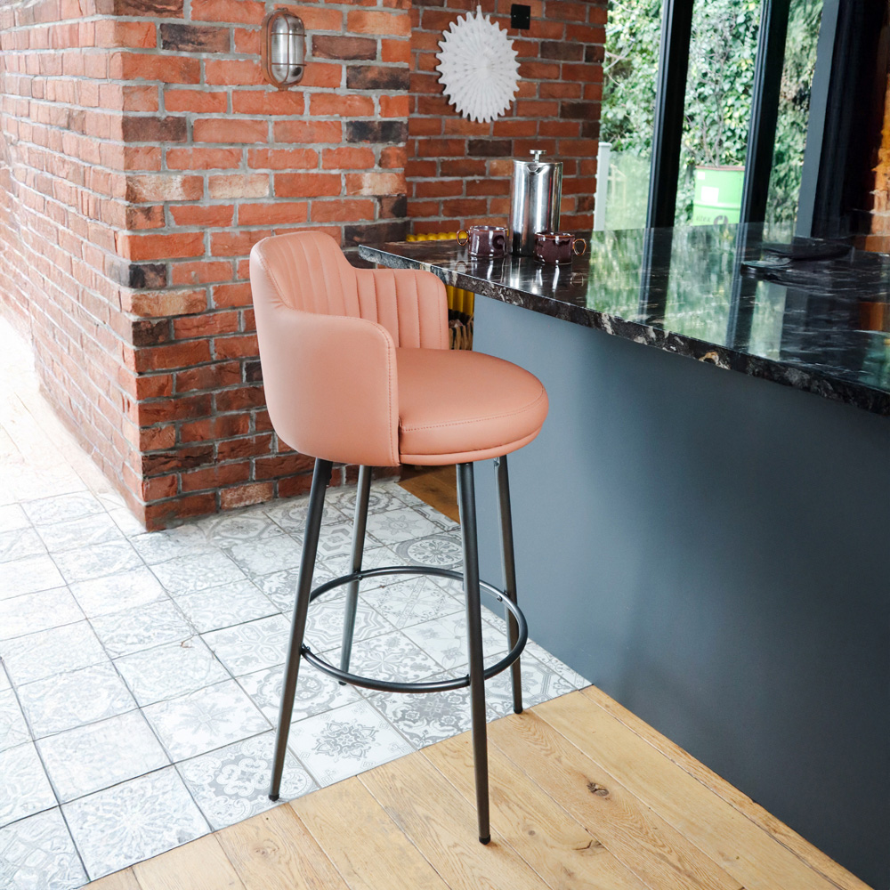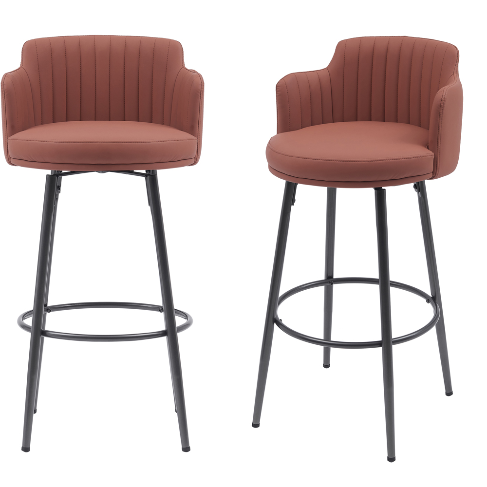 Introducing a set of two bar stools, designed with an elegant armchair style reminiscent of retro Art Deco. These stylish stools, upholstered in tan PU leather, bring a touch of luxury to any kitchen or breakfast bar. Each stool features a smooth swivel mechanism, offering easy movement and accessibility, perfect for entertaining guests.