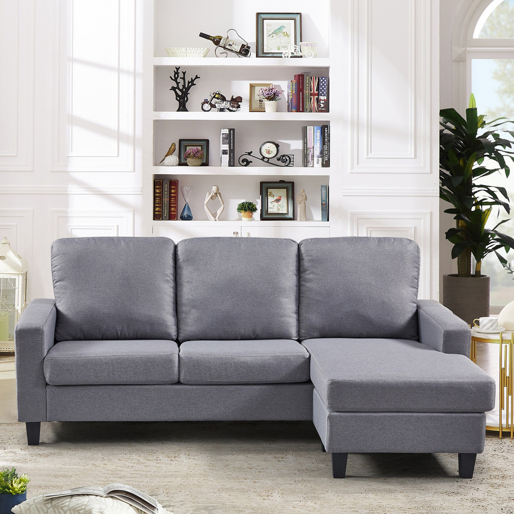 Style and versatility combine in the Modbury 3 Seater Light Grey Reversible Corner Sofa. Upholstered in a resilient textured fabric, this sofa brings both comfort and contemporary design to your living space. The reversible corner design allows you to effortlessly adapt your layout, offering a fresh perspective whenever you desire. Thick foam seating ensures unparalleled comfort, while sleek black block feet provide a sturdy and stylish foundation. For easy care and maintenance, the back and seat cushions are removable. Benefit from our white glove delivery and assembly service, guaranteeing a seamless and convenient setup in your home.