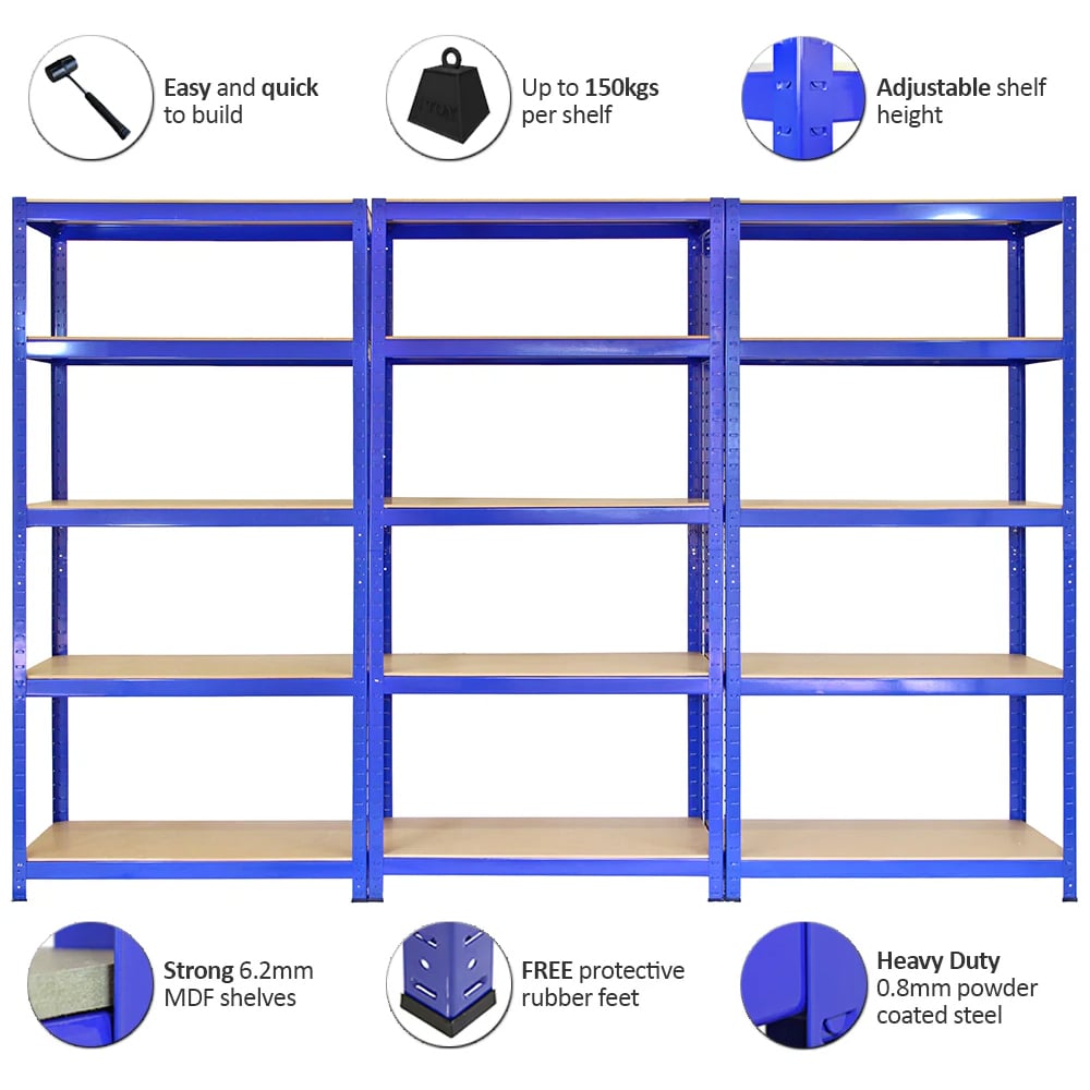 Organise your space effortlessly with this heavy-duty shelving unit, perfect for garage, workshop, or storage room. A robust 5-shelf design, each shelf boasts a 150kg capacity (evenly distributed weight), offering ample storage for a wide variety of items. Constructed from durable 0.8mm thick steel with solid 6.2mm MDF shelves and a hardwearing powder-coated finish, this unit is built to last. Rubber feet protect your floors, and the boltless design ensures quick and easy assembly. At 150cm H x 75cm W x 30cm D, it',s compact yet spacious. Plus, split it in half to create two handy workbenches. Buy three or more and receive a free rubber mallet.