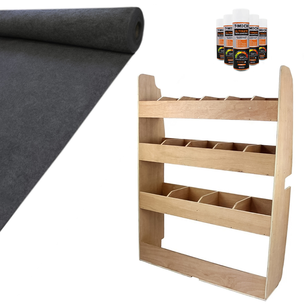Transform your Ford Transit Custom SWB van',s interior with this complete lining and racking solution. The 11m² (5.5 x 2m) anthracite van lining, a durable and highly flexible 3mm thick polypropylene carpet (3.4kg), conforms perfectly to your van',s contours, accommodating wheel arches and other features without creasing. Completely bleachable for easy cleaning, it',s ideal for vans, motorhomes, and cars. Complementing the lining is a robust three-tier racking unit (102 x 30 x 136cm), constructed from 12mm plywood and designed for either the nearside or offside. The shelves offer ample storage with six compartments on top, five in the middle, and four on the bottom. Secure fitting is ensured with included fixtures and fittings. Five cans of T-Mech ultimate trim adhesive are provided, boasting 120°C high-temperature resistance and a controllable nozzle for precise application. This adhesive is specifically formulated for automotive use.