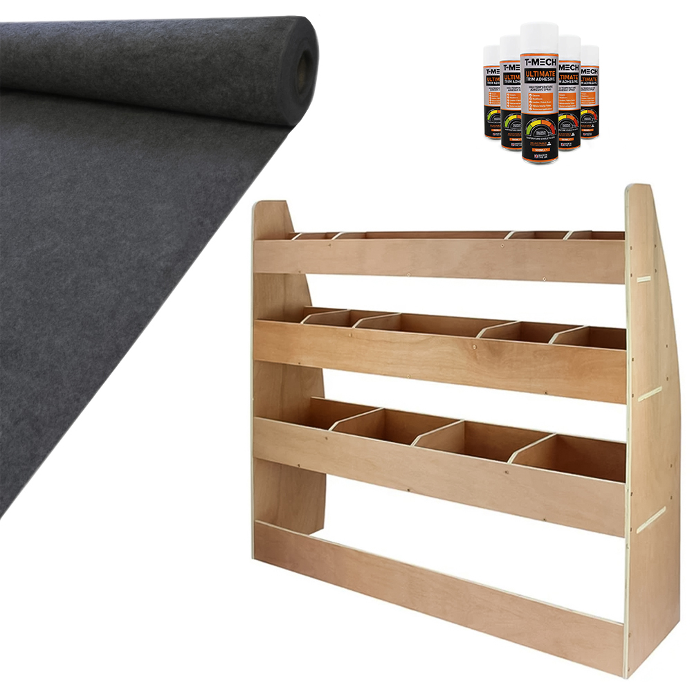 Complementing the carpet is a robust three-tier racking system, crafted from durable 12mm plywood. This unit boasts 14 compartments for efficient storage and is designed to mount securely on either the nearside or offside of your VW Caddy SWB. All necessary fixtures and fittings are included for straightforward installation.