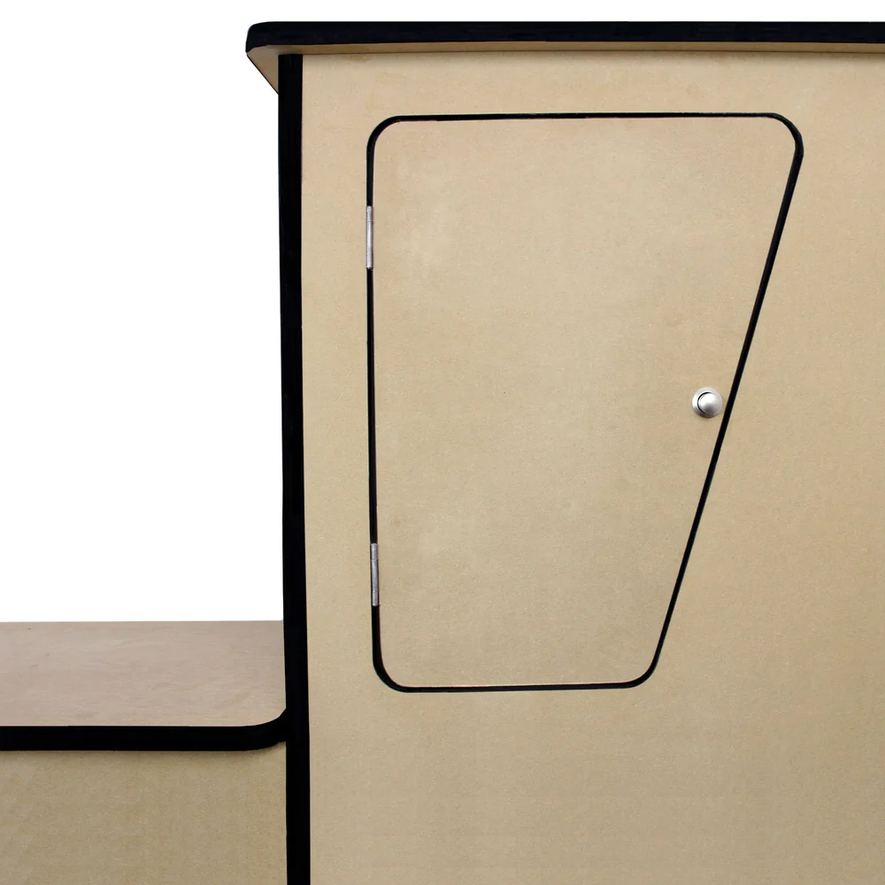 The accompanying camper kitchen, crafted from sturdy, unfinished MDF, is ready for your personal touch – sand, paint, wrap, or spray to match your style. Enjoy the convenience of a built-in wine rack, cleverly designed to secure bottles during transit, and three generously sized cupboards featuring push-button handles. Assembly is straightforward using cam locks and bolts.