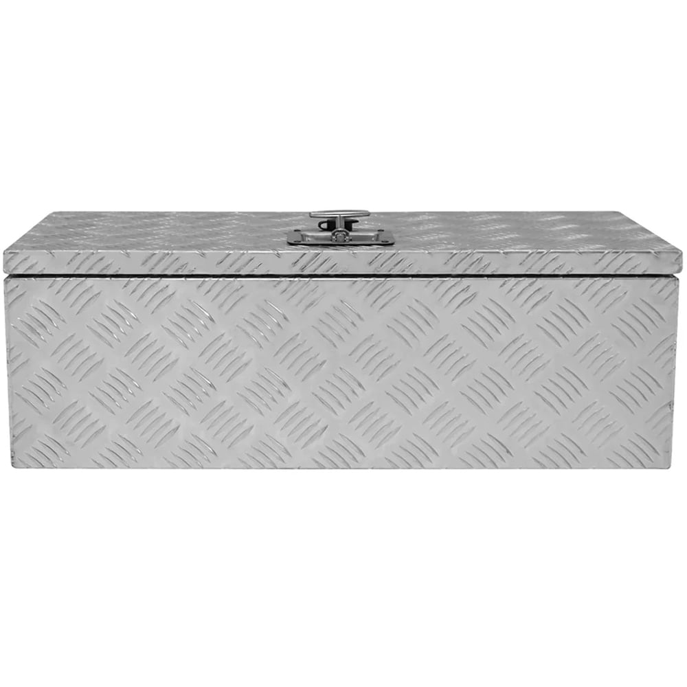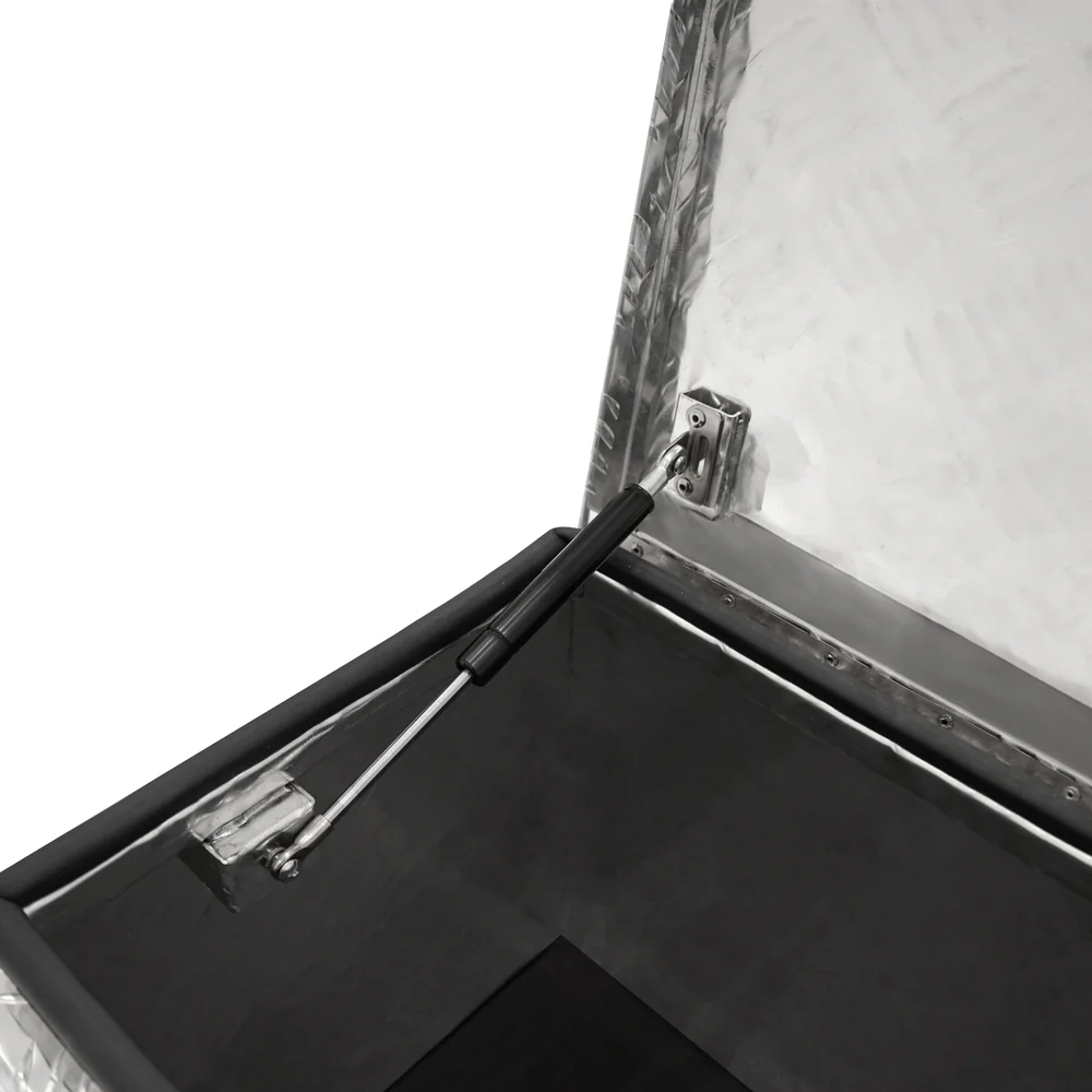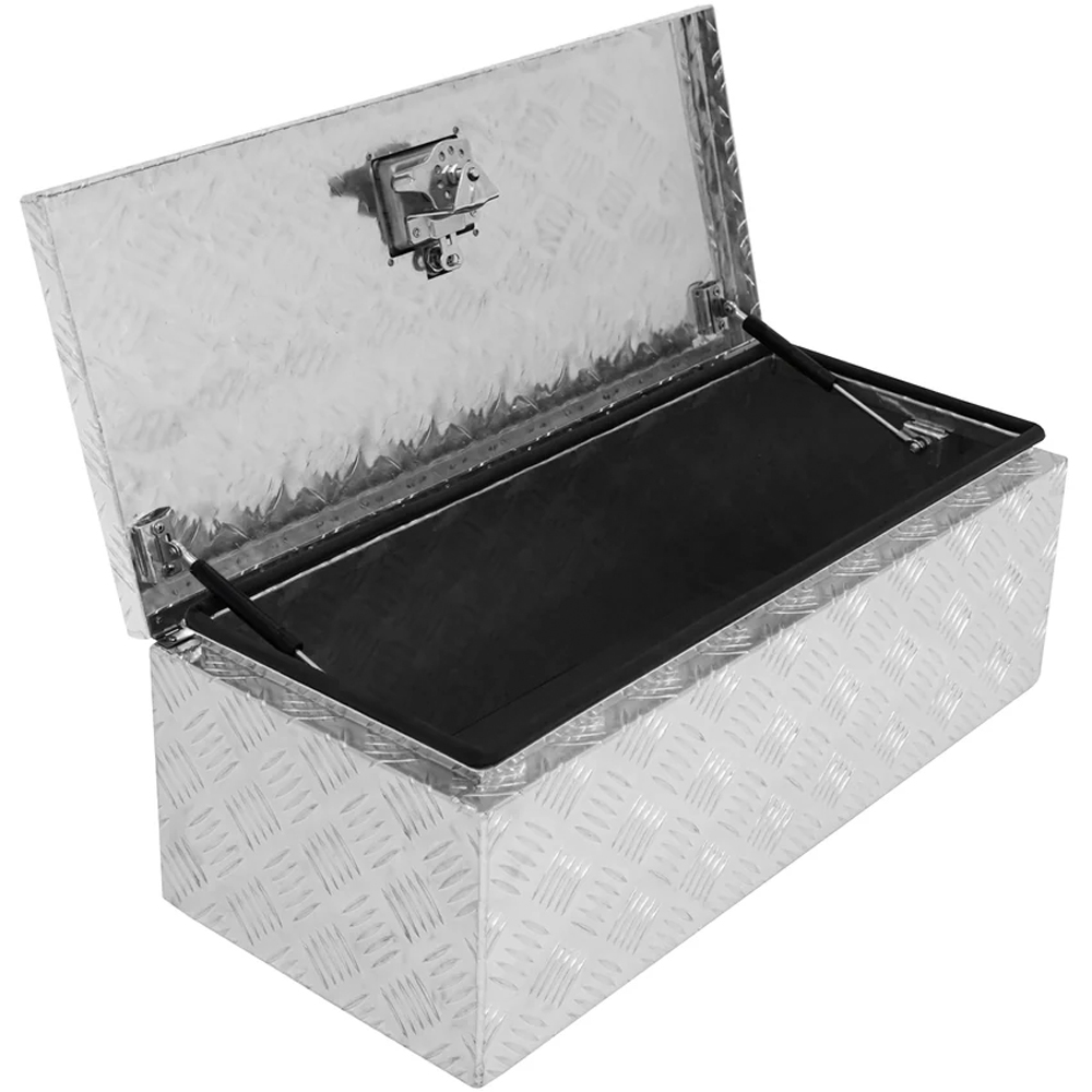 Keep your tools organised and secure with this heavy-duty aluminium toolbox. Perfect for tradespeople and DIY enthusiasts alike, its 60-litre capacity handles a wide range of equipment. Securely mount it to your trailer or pickup for peace of mind transporting tools, straps, and coupling locks. Built from robust 1.5mm aluminium checker plate, this toolbox is designed for exceptional strength and durability. A fully waterproof design, with a rubber-sealed lid and opening, keeps contents dry and clean. The welded construction and double locking system with two keys provide maximum security for your valuable tools and accessories. The hinged lid, assisted by two gas struts, allows for effortless access. A rubber base lining keeps everything in place during transit. Silver finish. Dimensions: H25 x W74.5 x D32cm. Weight: 5.9kg.