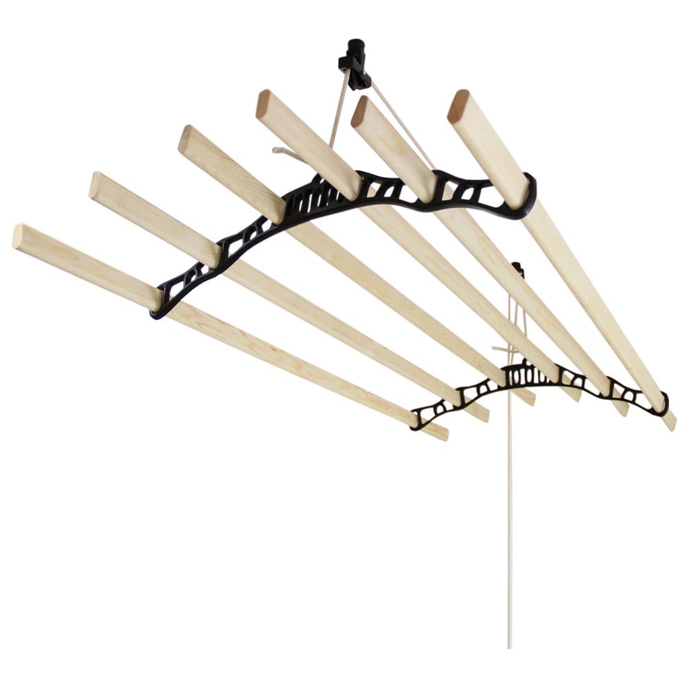 Introducing the Monster Shop Black 6 Lath Clothes Airer, a stylish and practical solution for drying your laundry efficiently. With an impressive reach of 1.8 meters, this airer elevates your clothes to harness natural heat, allowing them to dry beautifully within just 2 to 4 hours. Crafted with durability in mind, it features six high-quality, ethically-sourced pine laths, designed to handle even the heaviest clothing loads with ease. The clear-coat varnished timber exudes a classic charm, perfectly complementing the robust cast-iron rack ends and pulleys, ensuring longevity and strength for years to come. Specifications. Material: Ethically-sourced pine, cast iron rack ends, pulleys, wheels, cotton rope. Finish: Clear-coat varnished pine, powder-coated cast iron. Dimensions: 180cm (L) x 56cm (W) x 14cm (H. Weight: 4.5kg. Experience the perfect blend of functionality and aesthetic appeal with this exceptional clothes airer, designed to make laundry day a breeze.