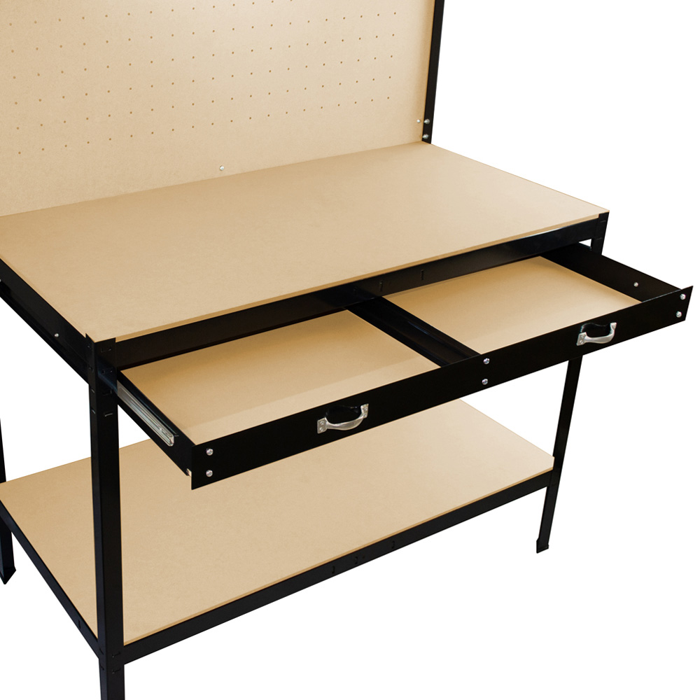Elevate your workspace with the Monster Shop Black Workbench, complete with a convenient pegboard and integrated lighting. This versatile workbench is designed to enhance your workshop, garage, or shed, providing ample storage and a clutter-free area for all your DIY endeavours. With generous dimensions of 155 x 60cm, it boasts a robust weight capacity of 200kg, ensuring you can tackle even the most demanding tasks with confidence. Illuminate your projects with the built-in 9W LED light, strategically positioned above the workspace for optimal visibility. The 2m power cable offers flexible placement options, allowing you to adapt the setup to your needs effortlessly. The spacious lower shelf supports up to 100kg, perfect for housing toolboxes and larger equipment, while the handy top shelf adds an extra 30kg capacity for smaller items that require a designated spot. Crafted with practicality at its core, this workbench features an array of smart storage solutions, all supported by a sturdy MDF surface that can withstand substantial loads. Assembly is a breeze, thanks to its nearly boltless design, and the included mallet simplifies the process. For added stability and floor protection, the unit is equipped with non-slip rubber feet. Weighing in at 26.9kg and measuring 155 x 120 x 60cm, this workbench is the ideal companion for both professional tradespeople and enthusiastic DIYers alike.
