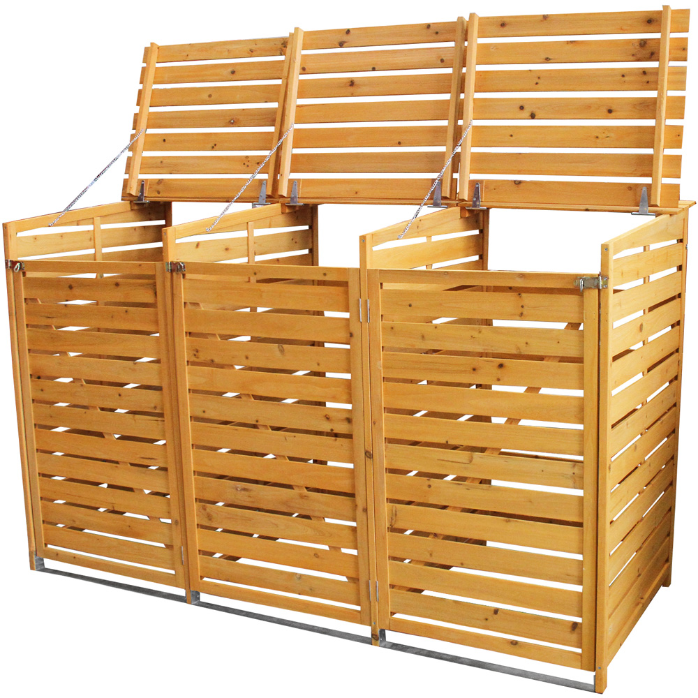 Organise your garden waste with ease using this stylish triple wheelie bin store. Crafted from durable Douglas fir wood, this unit adds a touch of elegance while keeping your bins neatly contained. The slatted design ensures good air circulation, keeping everything fresh. It',s not just for bins, use it for firewood, garden tools – whatever you need to store. Large front doors and chain-operated lids provide easy access. Secure your contents with the lockable doors (padlock not included) and fix it securely to a wall or fence using the provided kit. Quick and simple assembly. A perfect blend of practicality and style for your outdoor space. Dimensions: H1200mm x W1980mm x D810mm. Weight: 31.5kg. Brown finish.