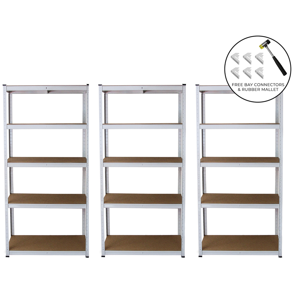 The E-Raxe White Racking system is a robust and practical storage solution, perfect for garages and workshops. This three-unit set boasts a substantial 200kg shelf capacity per unit and features a convenient central support bar for added stability. Effortless assembly is guaranteed thanks to its 100% boltless design. Furthermore, included free bay connectors allow for simple expansion by connecting multiple units together, creating a bespoke storage configuration to suit your needs.