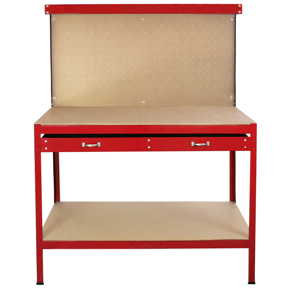 Transform your workspace with the Monster Shop Red Workbench featuring an integrated pegboard for effortless organisation. Equipped with 40 versatile hooks, this workbench allows you to hang essential tools conveniently, keeping them within reach. Its robust design accommodates a total weight of 40kg for stored equipment, while the full-length drawer beneath provides the perfect space for smaller items and accessories. The top shelf is capable of supporting up to 30kg, and the sturdy bottom shelf can handle an impressive 100kg. The expansive main work area boasts a remarkable weight capacity of 200kg, making it ideal for heavy-duty tasks. Assembly is a breeze with the included rubber mallet, ensuring you can set up your workbench in no time. With a pegboard thickness of 3mm, a weight of 25kg, and dimensions of 155 x 120 x 60cm, this workbench is the ultimate addition to any workshop or garage.