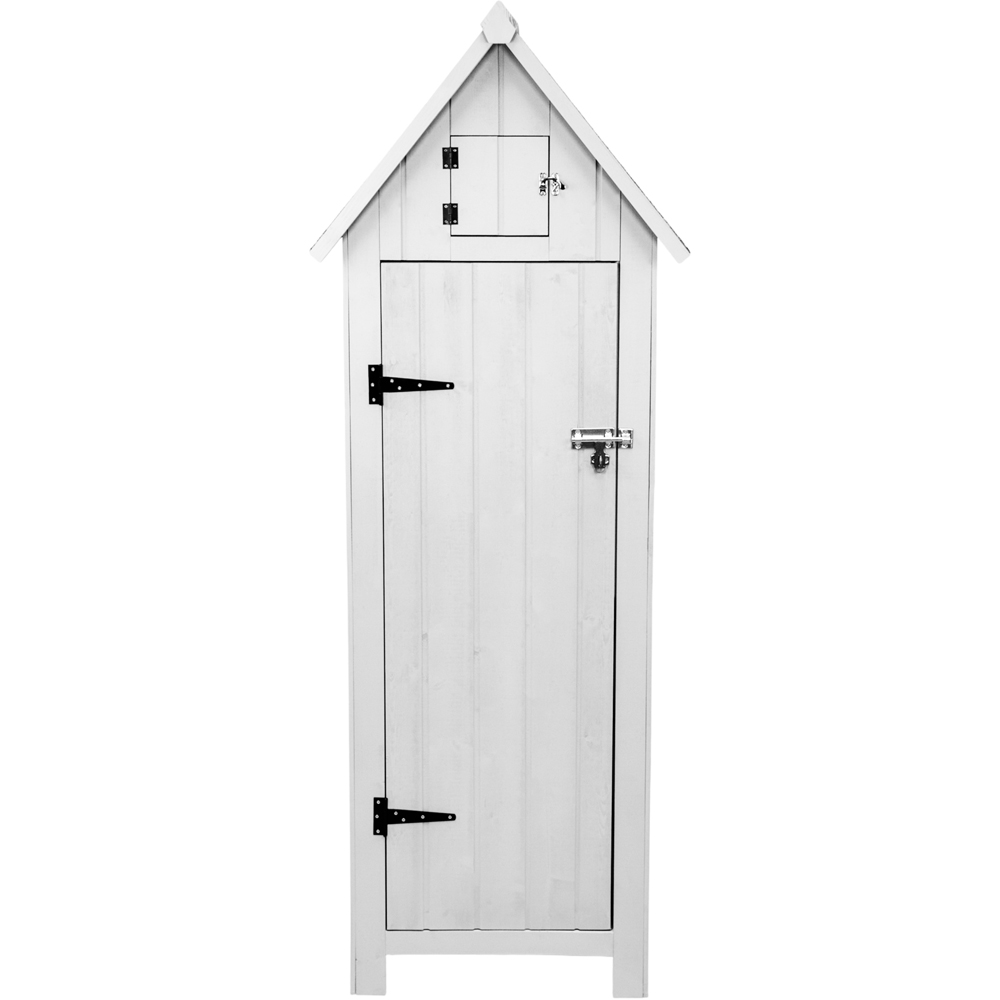 This stylish and functional wooden garden shed is the perfect solution for your outdoor storage needs. Three spacious corner shelves, each with a 10kg maximum load capacity, offer ample space for tools and equipment. Four hooks on the door provide additional storage for smaller items. A large roof hatch, accessible via its own door, doubles your storage capacity, remove the base slats to increase the main compartment',s height. The shed',s narrow, tall design is ideal for smaller gardens and balconies, easily accommodating taller equipment. A large door with reinforced hinges allows easy access, secured by a padlock and four keys. The roof compartment features a secure latch. For enhanced stability in windy conditions, a ground-fixing kit is included. Constructed from high-quality fir wood, the shed features a sloped roof with an asphalt coating to ensure rainwater runs off effectively, keeping the interior dry. The waterproof paint finish complements any garden. Arriving flat-packed with all necessary screws for quick assembly, modern grey covers are included to conceal the screws for a neat finish.