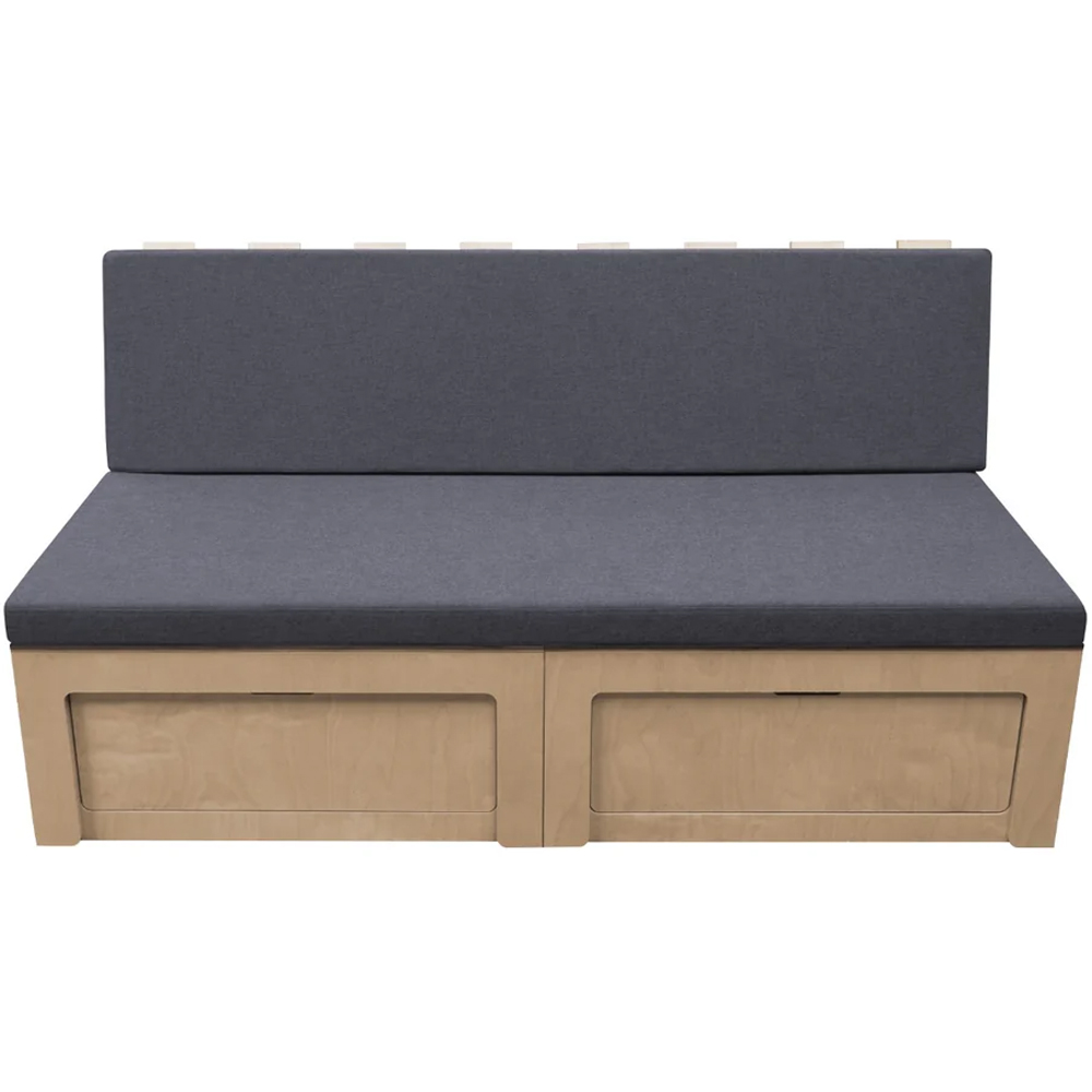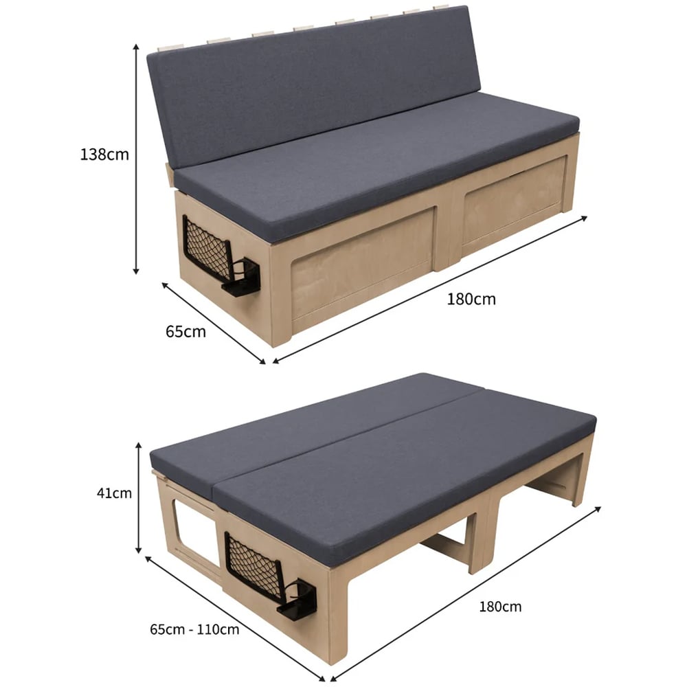 Transform your camper van into a cosy haven with the Camper Van Pull-Out Bed. Perfect for travellers who value both comfort and practicality, this ingenious design cleverly combines seating and sleeping space. By day, it's a comfortable seating area; by night, it effortlessly converts into a spacious bed, maximising your van's interior. The smooth pull-out mechanism makes the transformation quick and easy. Clever storage solutions are built-in: two under-bed cabinets with hinged lids and a central divider, plus two handy storage nets and a secure cup holder keep everything organised. Its sleek, modern design complements any camper van interior, and the unfinished surface allows for complete customisation – sand, paint, wrap, or spray it to match your style. Built to last, the sturdy birch plywood base supports up to 300kg, ensuring comfortable relaxation for you and your companions. A high-density 8cm sponge mattress, topped with a removable and machine-washable linen cover, guarantees a restful night's sleep. Large wheel arch cutouts (up to 350mm clearance) accommodate various van models. All fixings are included for quick and straightforward assembly, and the secure fastening system keeps the bed firmly in place while travelling. Create a practical yet inviting living space in your van – the perfect retreat after a day of adventure.
