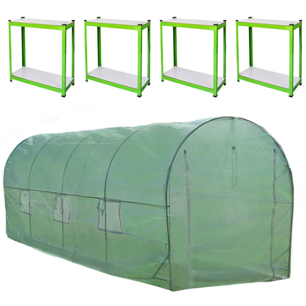 This polytunnel offers a generous growing area of 19.7ft x 9.8ft with a height of 6.5ft. The polyethylene cover is 150gsm thick. The complete structure weighs 48.8kg, and the frame boasts a 25mm diameter. The racking units have a maximum load capacity of approximately 175kg, utilise 0.7mm thick steel, and feature 4mm MDF boards.