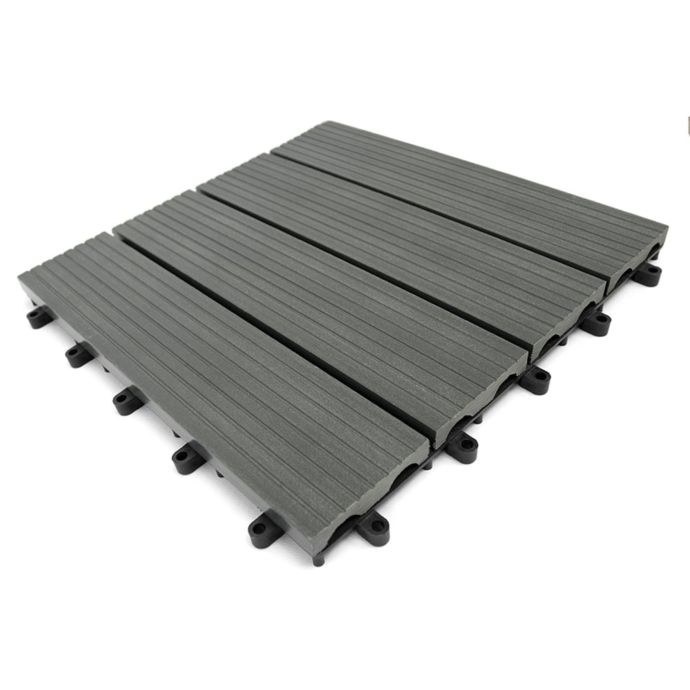 Give your garden the makeover it deserves with the 33-pack of grey WPC decking tiles. Perfect for your patio, balcony, swimming pool or hot tub, these tiles are a quick, simple outdoor styling solution. These high-quality WPC tiles feature a quick connect interlocking function, which offers you easy and toolless installation. Made of quality wood plastic composite, these tiles are water resistant and very durable for years of use. With a durable plastic base, the decking remains off the floor to reduce water damage and rot, keeping your tiles looking lovely for longer. Use your imagination and create your own bespoke decking area today. You can lay the deck tiles in a linear system or the chequered design and other designs in between. Installing them couldn’t be easier; with no tools needed, simply click and go!