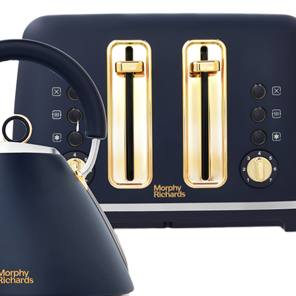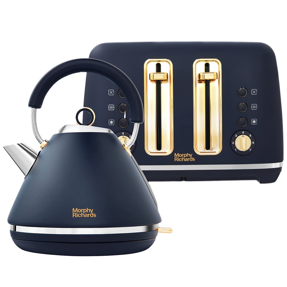 Upgrade your breakfast routine with the stylish Morphy Richards Accents 950085 Blue Kettle and 4-Slice Toaster Set. This sleek blue and gold appliance set blends classic design with modern convenience, perfectly complementing any kitchen. The 1.5L kettle features a rapid 3000W boil for quick heating and a removable limescale filter for consistently pure water. Toasting is a breeze with the 4-slice toaster's high-lift function and variable browning control, ensuring perfectly browned bread every time. A removable crumb tray keeps cleanup simple. Enjoy faster mornings and a touch of elegance with this efficient and stylish set.