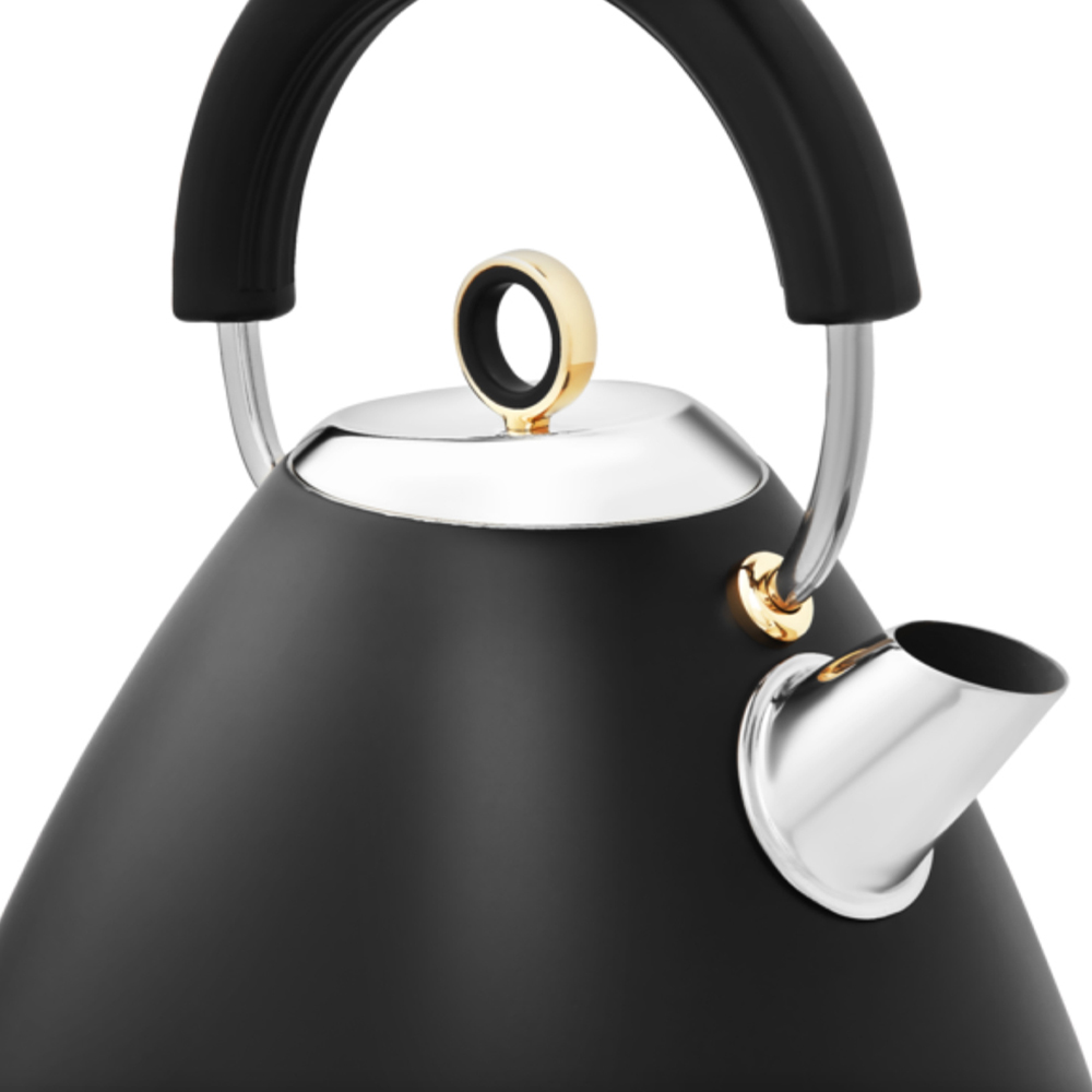 Upgrade your kitchen with the Morphy Richards Black Accents Pyramid Kettle - a stylish statement piece that delivers on performance. Its iconic pyramid silhouette and gold accents add a touch of class, while the 1.5L capacity and 3kW rapid boil element ensure you're enjoying a perfectly brewed cup in moments. The easy-view water window helps you boil only what you need, saving energy, and the removable limescale filter guarantees a pure, delicious drink every time. This kettle is a must-have for any home.