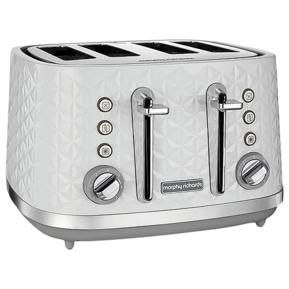 Enjoy effortlessly prepared breakfasts with the Morphy Richards Vector 950062, a stylish white kettle and toaster set. Its 3D patterned finish adds a touch of elegance to your kitchen. Boil up to six cups of water rapidly thanks to the kettle's 1.5L capacity and powerful 3000W element. Convenient features include an easy-view water window and a removable limescale filter for consistently great tasting drinks. The four-slice toaster ensures perfectly browned toast every time with its auto pop-up function, variable browning control, and removable crumb tray for easy cleaning. A convenient reheat setting completes this efficient and easy-to-use breakfast set.