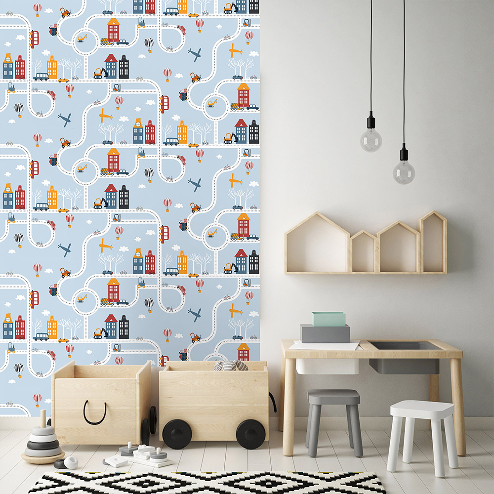 A fun and playful city design, busy streets with lots of transport, travelling past big buildings and parks. Great for kids who love cars and colour.