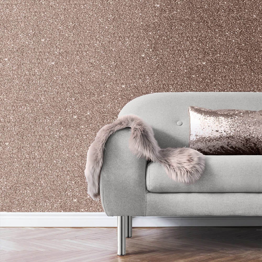 Elevate your space with Muriva Sparkle Rose Gold Wallpaper. This opulent wallpaper, perfect for creating a glamorous backdrop, features a heavyweight vinyl base topped with highly reflective foil. An embossed texture and added glitter deliver a truly luxurious finish, reflecting the current trend for metallic accents. The shimmering rose gold effect adds maximum glitz to any room.