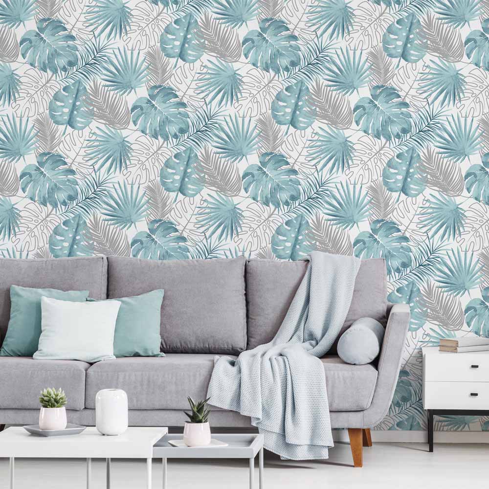 Transform your space with Muriva Tropical Leaves Blue Wallpaper—a stunning design bringing modern tropical vibes to your home. Delicate watercolour leaves shimmer with eye-catching glitter, creating a luxurious visual effect perfect for living rooms or bedrooms. Its high-quality, smooth, and durable construction makes hanging a breeze (paste the wall application!), and the wipeable surface ensures easy cleaning. Use it to create a feature wall or refresh an entire room. Offset design match, 64cm repeat. Each roll measures 10.05m long and 53cm wide.