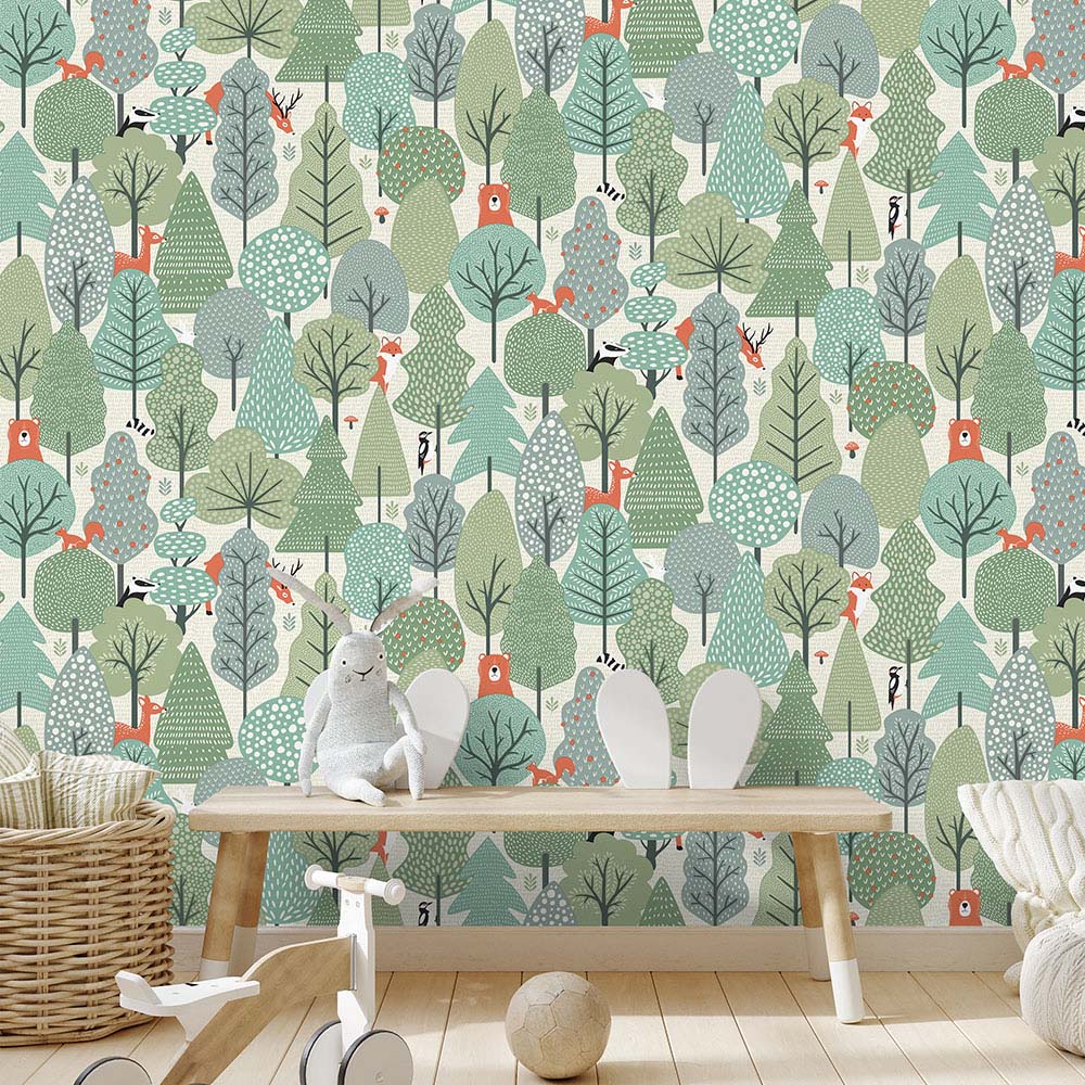 Discover the enchanting allure of this Scandi-inspired design. Deer, badgers, and squirrels playfully peek from amongst whimsical trees, their forms subtly shimmering with a metallic ink finish. A delightful woodland scene.