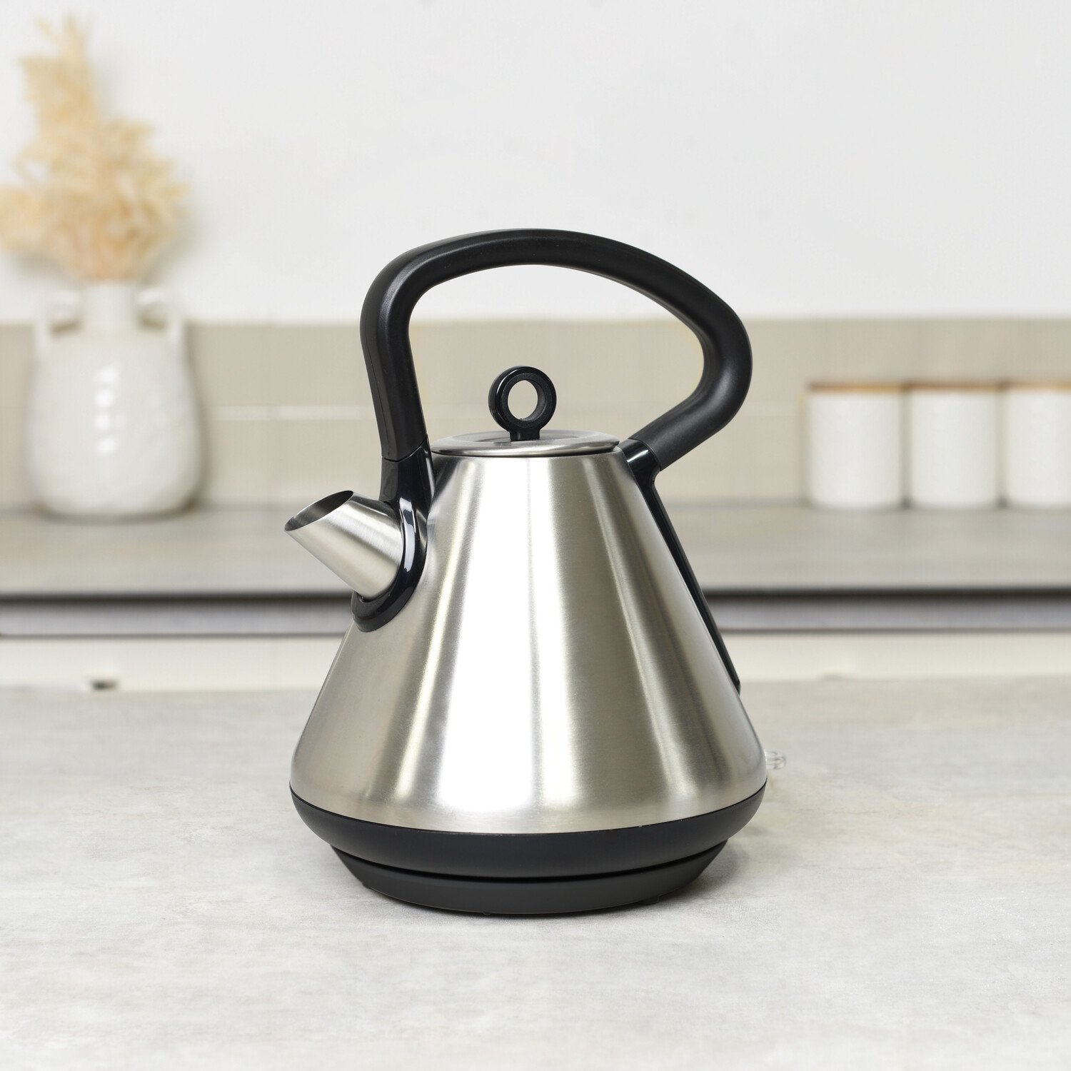 Boil water in style with this 1.7L Pyramid Kettle—a must-have for any modern kitchen. Its classic pyramid shape and range of colours add a touch of elegance to your countertop. A rapid 3KW boil element ensures your water is ready in a flash. Convenient cup markers on the kettle's exterior allow for precise water measurement, perfect for your daily brew.