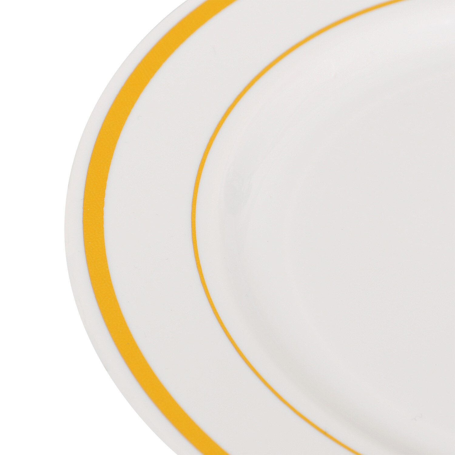 This pack contains eight gold-rimmed plastic plates, ideal for parties and special occasions. These BPA-free and non-toxic plates offer a safe and reliable dining solution. Designed for convenience, the plates are easy to clean and can be disposed of or reused. They're guaranteed to add a touch of elegance to any dining or buffet setup.