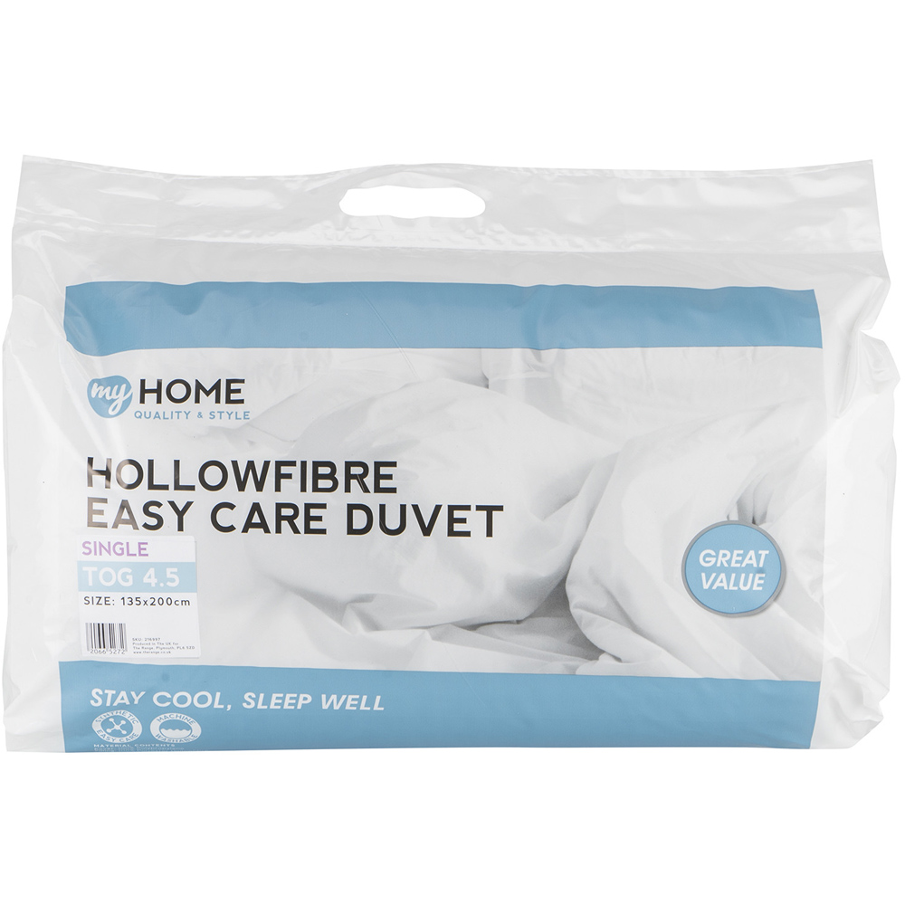 Experience blissful sleep through slightly warmer months with this My Home 4.5 tog duvet. Its lightweight construction and polyester hollow fibre filling provide exceptional breathability, preventing overheating while maintaining a luxuriously plump and cosy feel night after night.