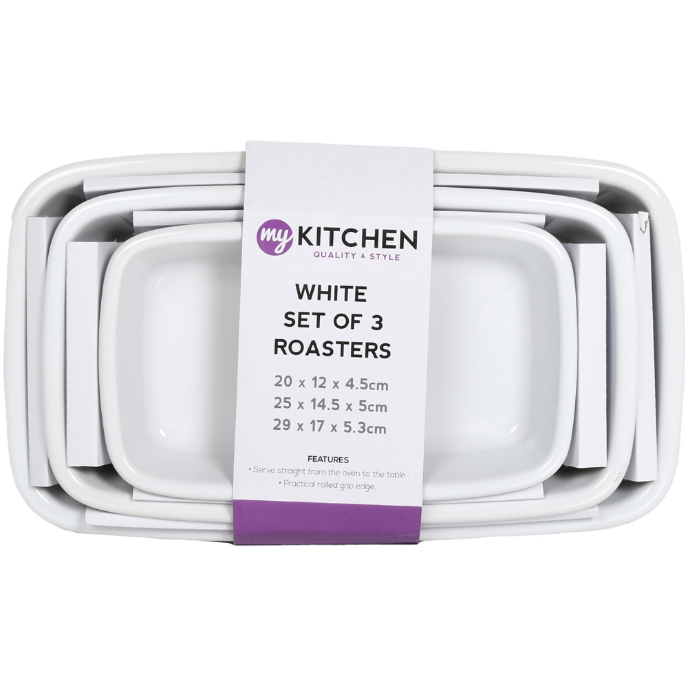 Three-piece white roaster set. Modern white design, ideal for kitchen or dining room. Sizes perfect for roasting vegetables, meat, and more. Features easy-grip edges and durable, easy-clean stoneware.