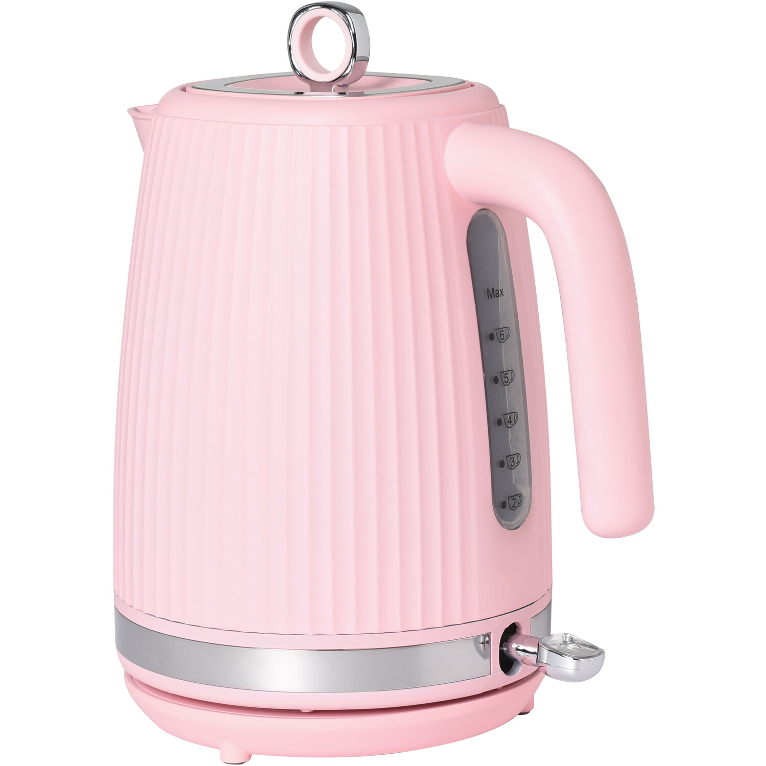 This 1.7L Contour Plastic Kettle adds a touch of style to any modern kitchen. Available in greige or pink, its simple striped contour design makes a statement. Features include an internal metal cup marker, a concealed heating element, and an automatic cut-off.