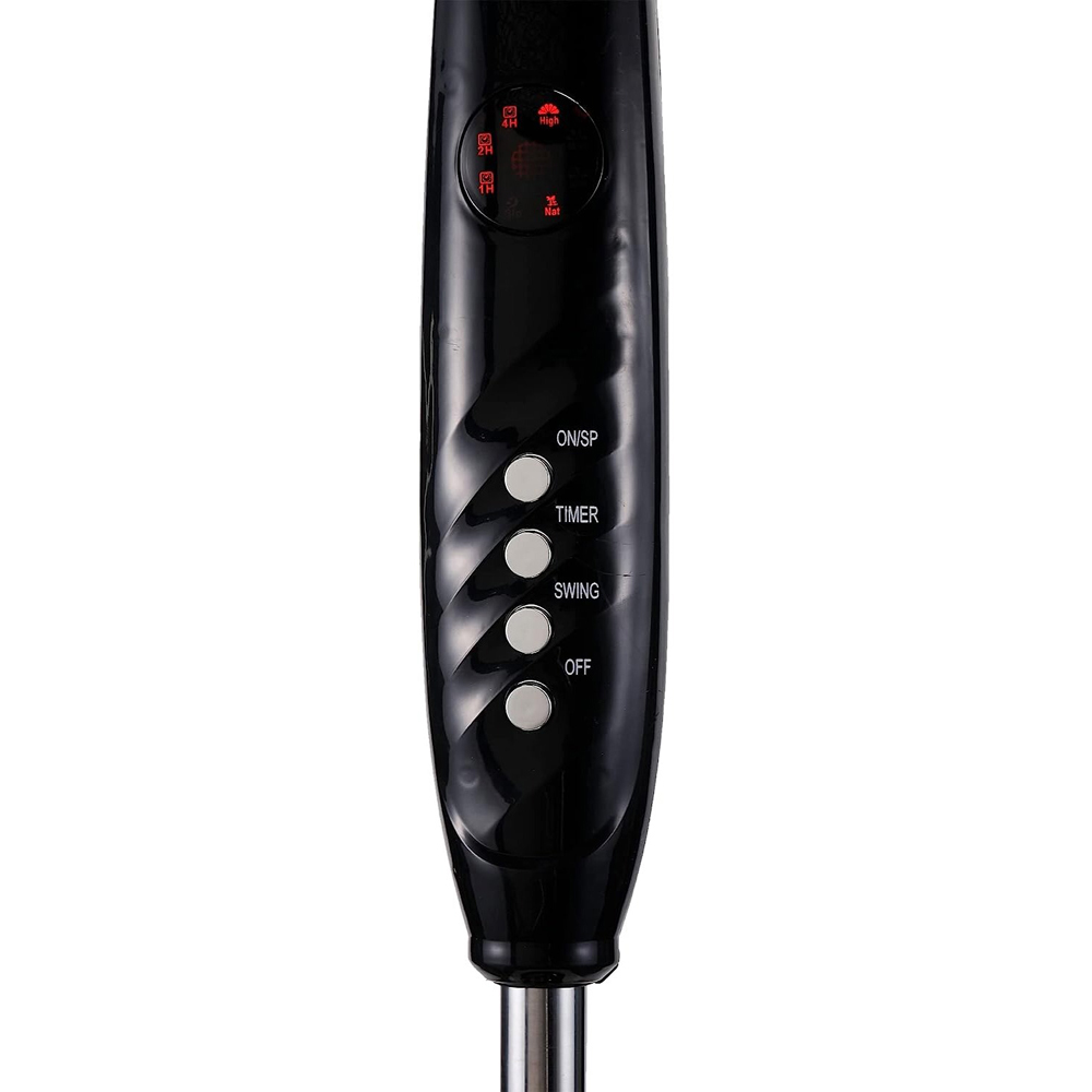 Enjoy cool comfort all summer long with the MYLEK Black Pedestal Fan (51 inch). Its sleek design complements any room without sacrificing valuable floor space, making it perfect for bedrooms, offices, living rooms, and more. Select your ideal airflow with three speed settings. A convenient 7.5-hour timer lets you schedule on/off cycles for personalised comfort. Adjust the height from 116cm to 130cm to suit your needs, the fan itself measures 16 inches at its highest point. Oscillating and swivel functions ensure even air circulation. Effortless control is at your fingertips with the included remote.