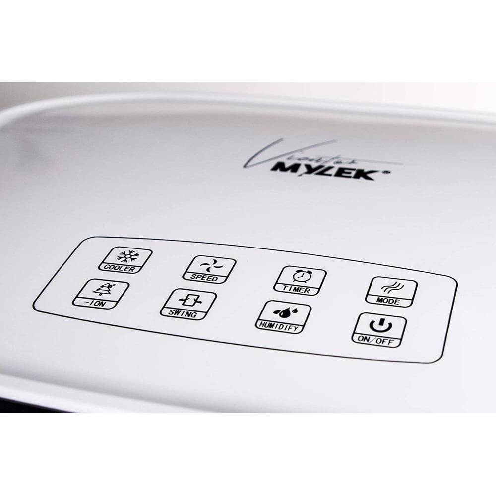 Beat the heat with the MYLEK White and Black 10L Air Cooler! This portable cooler uses evaporative cooling to create a refreshing breeze, humidifying the air and adding invigorating ions. Its three fan speeds and timer settings, controlled by remote, let you customize your cooling experience. The convenient wheels allow for easy portability, and you can add ice packs for an extra cooling boost.