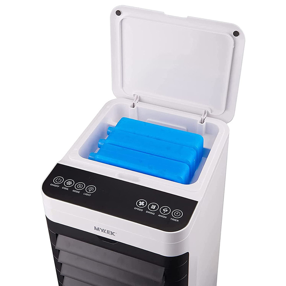 Stay cool and comfortable with the MYLEK White and Black Air Cooler with Remote. This energy-efficient cooler uses evaporative cooling to naturally chill your space, consuming only 75W of power. Enjoy customizable comfort with three fan speeds and three modes, including a refreshing pulsating breeze. A 12-hour timer and remote control provide effortless operation, perfect for nighttime use. Its lightweight design and large 6L water tank ensure easy mobility and infrequent refills. For extra cooling power, four ice packs are included.