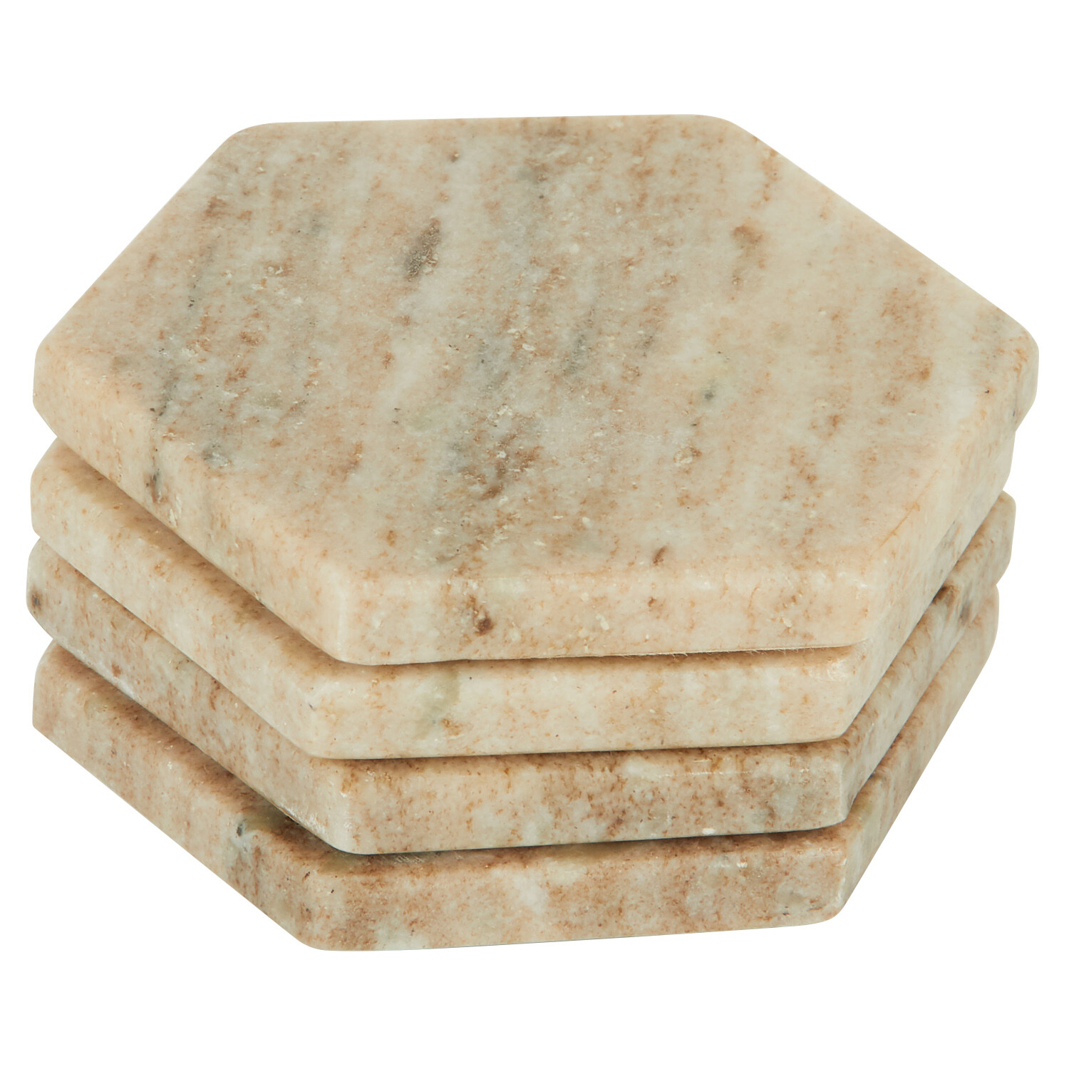 Introduce a touch of refined elegance to your dining experience with this set of four Sandstone Marble Coasters. Stylish and practical, these coasters combine a distinctive hexagonal shape with a marble-effect design. They not only enhance your dining area's aesthetic but also provide reliable protection for your furniture against unsightly water rings. An essential addition to any home.
