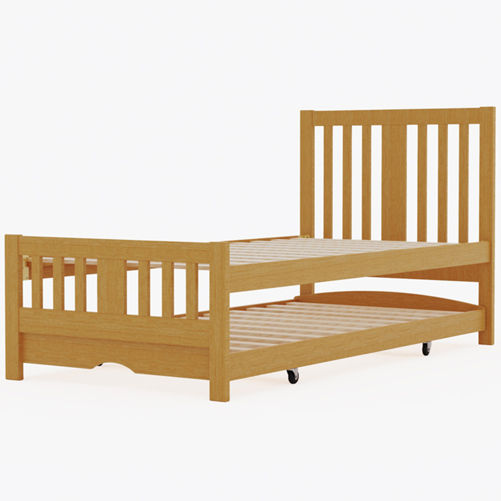 Enhance your bedroom',s charm with the Natural Wood Guest Bed and Trundle. This traditional-style guest bed boasts a high headboard and a cleverly concealed pull-out trundle with foldable legs, providing extra sleeping space. The low foot end and solid slatted base ensure comfort and support. Its robust frame and soothing finish offer both stability and a touch of elegance, complementing various interior styles.