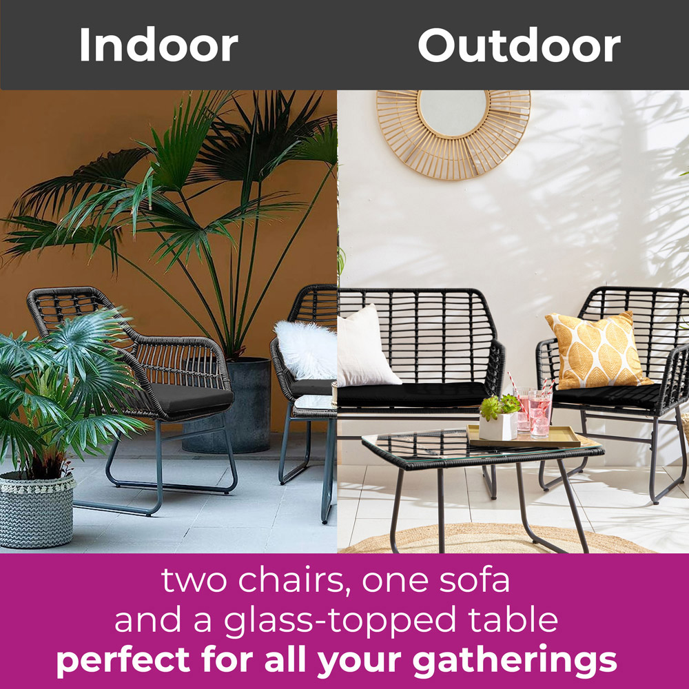 This modern, trend-forwards sofa set isn't just for the garden; it also makes a perfect addition to any conservatory or indoor space. The set includes two garden chairs, a garden sofa, and a glass-topped garden table, providing everything you need for memorable garden gatherings.