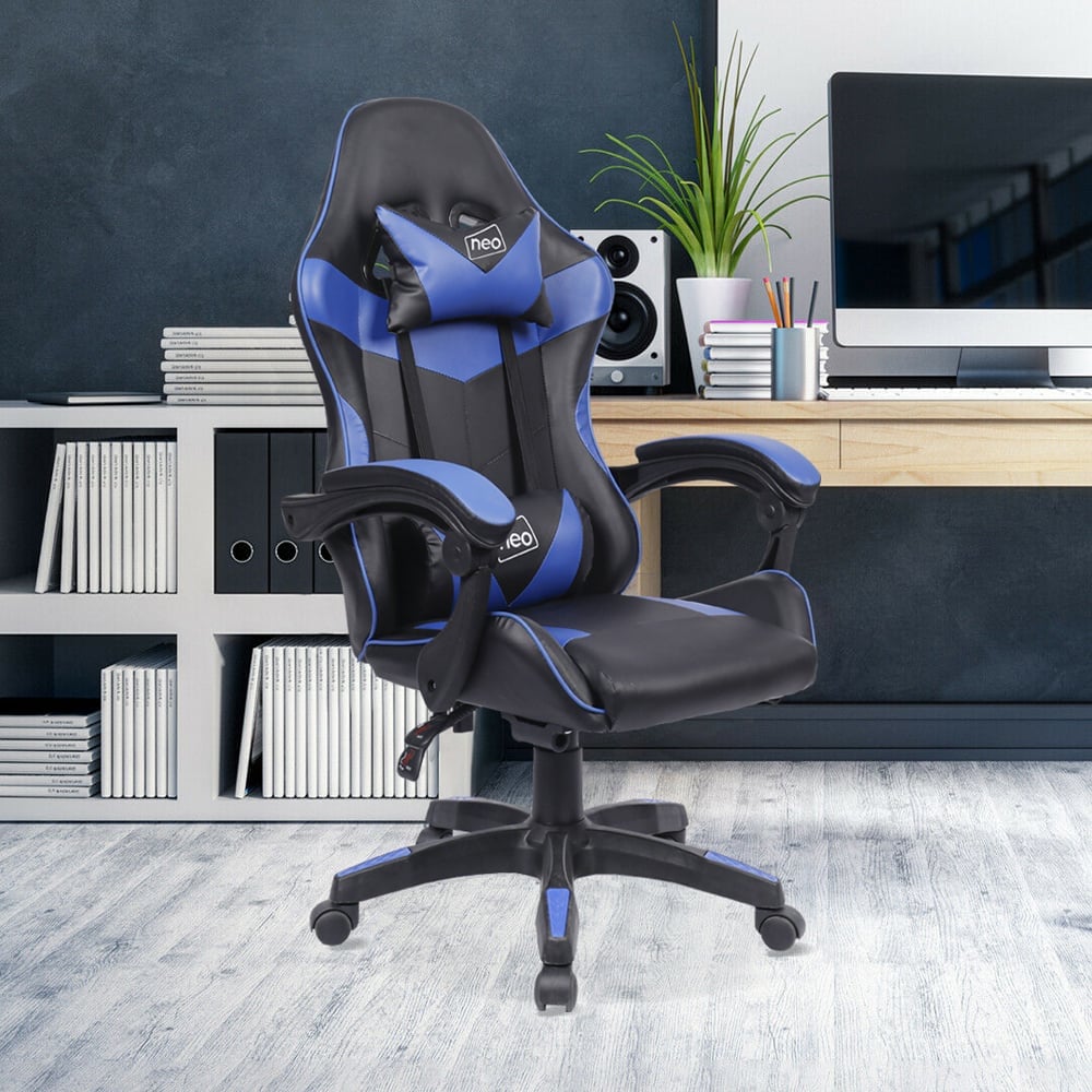 This fully reclining Neo racing-style chair in vibrant blue is crafted from high-quality PU leather. Ergonomically designed for comfort, it features multiple adjustable settings, lumbar and headrest support, making it perfect for gaming, studying, or working. Experience superior comfort and support in any environment.
