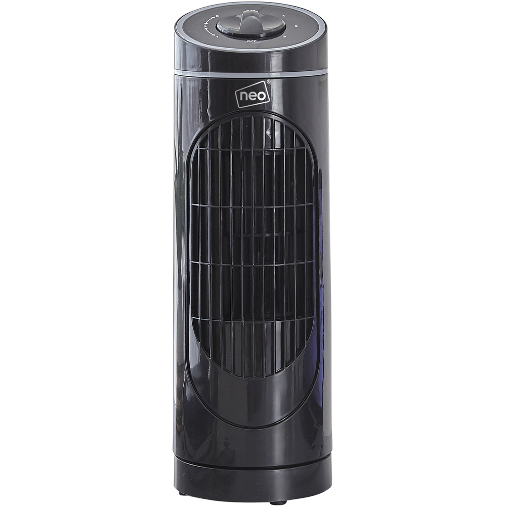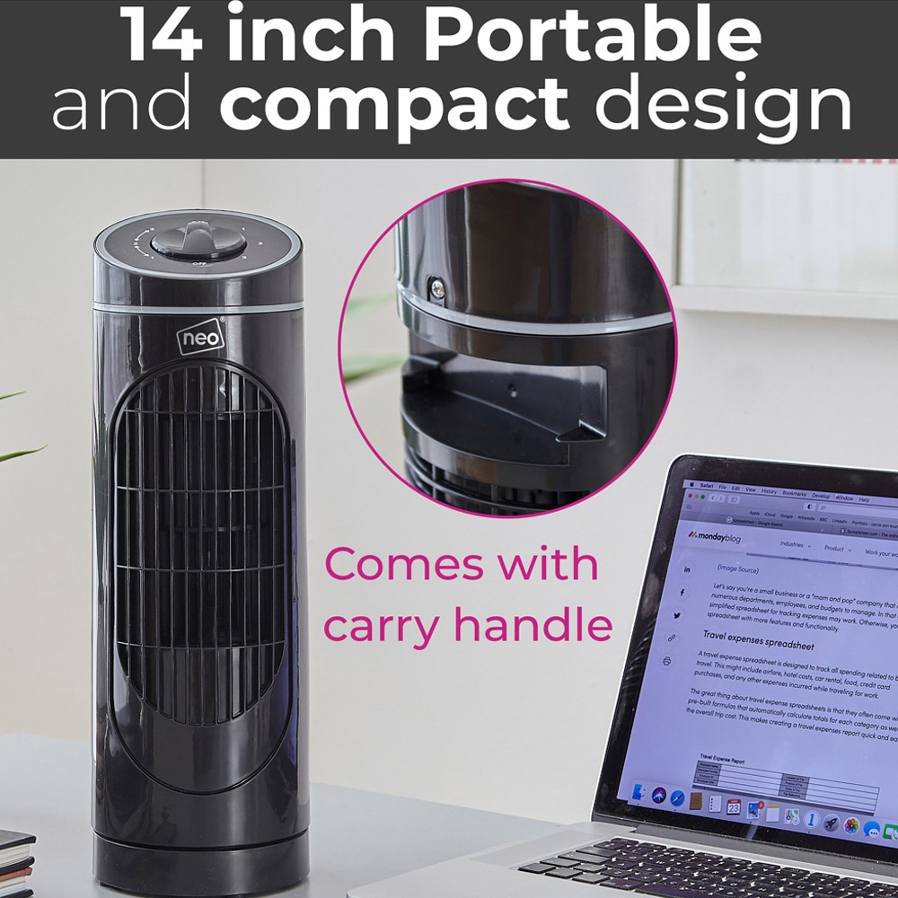 Beat the heat with the Neo Black 14-inch Desk Tower Fan. The 90-degree oscillation ensures a consistent and refreshing breeze. With six-speed settings, you can easily tailor the airflow to your preference. Its slim tower design ensures it occupies minimal space and is simple to assemble. Compact at just 14 inches, it's effortlessly portable between rooms. Ideal for creating a comfortable environment in shops, gyms, offices, homes, and other workplaces.