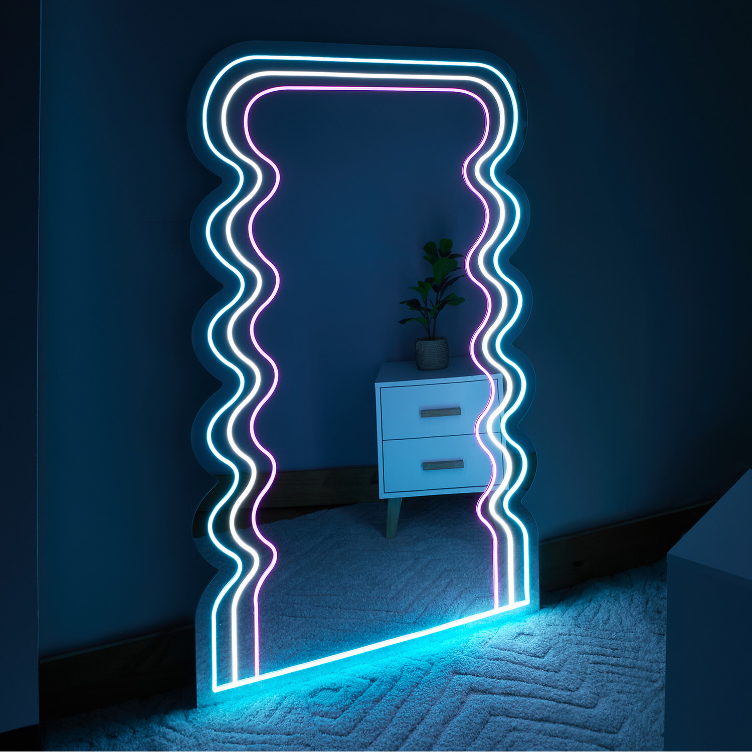 Add a touch of Hollywood glamour to your bedroom with this Neon Acrylic Wave Mirror. Its eye-catching wave design creates a modern and youthful feel, instantly updating your space. This lean-to mirror is mains-operated, illuminating with vibrant neon colours to make you feel like a movie star as you prepare for the day.